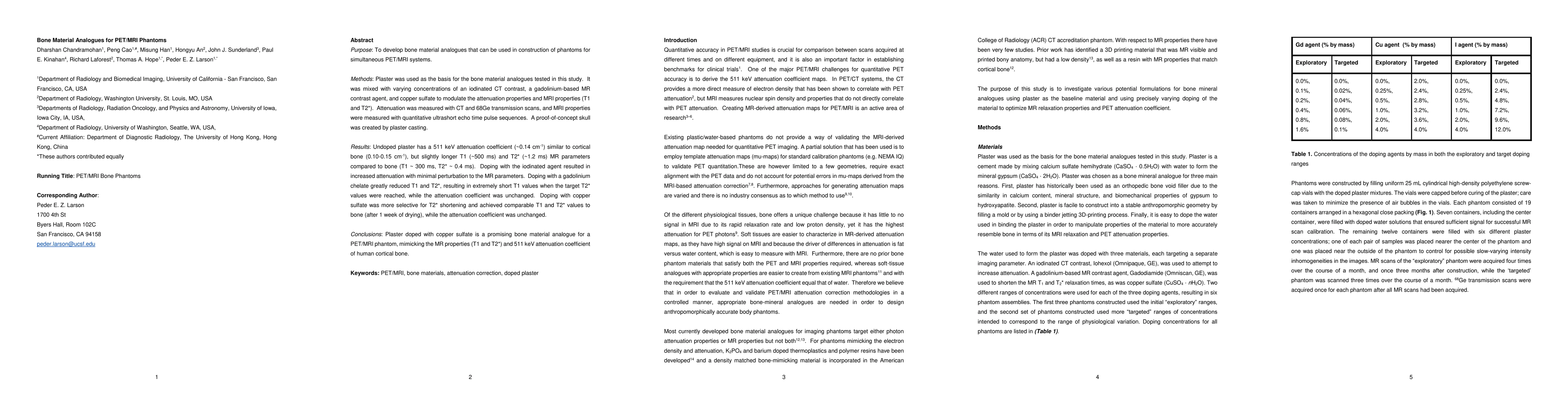 Researchers developed a bone material analogue using plaster doped with copper sulfate, mimicking human cortical bone's attenuation coefficient and MRI properties, making it suitable for PET/MRI phantoms.