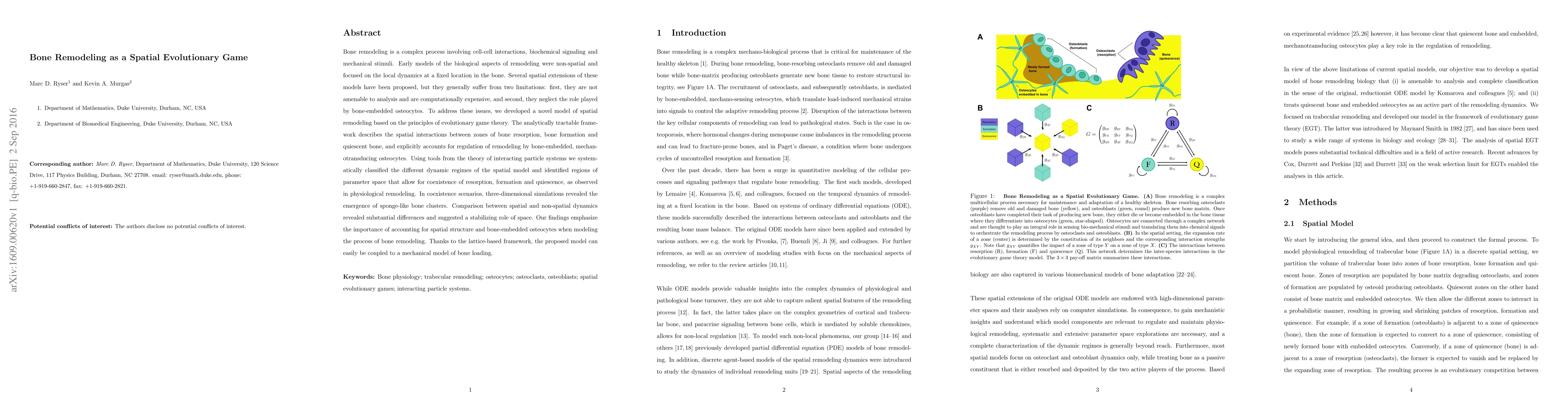 This paper develops a novel spatial evolutionary game theory model to describe bone remodeling, incorporating the role of bone-embedded osteocytes and addressing limitations of previous models. The model reveals the emergence of sponge-like bone structures and suggests that spatial interactions stabilize remodeling dynamics.