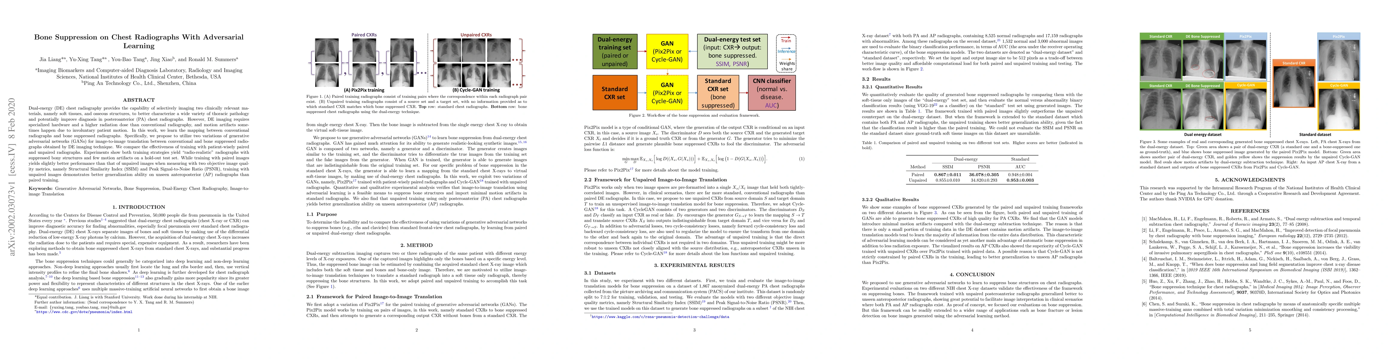 This research proposes using generative adversarial networks (GANs) to translate conventional chest radiographs into bone-suppressed versions, aiming to reduce the visibility of bony structures. Both paired and unpaired training methods are evaluated, showing comparable results in generating realistic radiographs with suppressed bones, though paired training performs slightly better in objective metrics, while unpaired training generalizes better to unseen data.