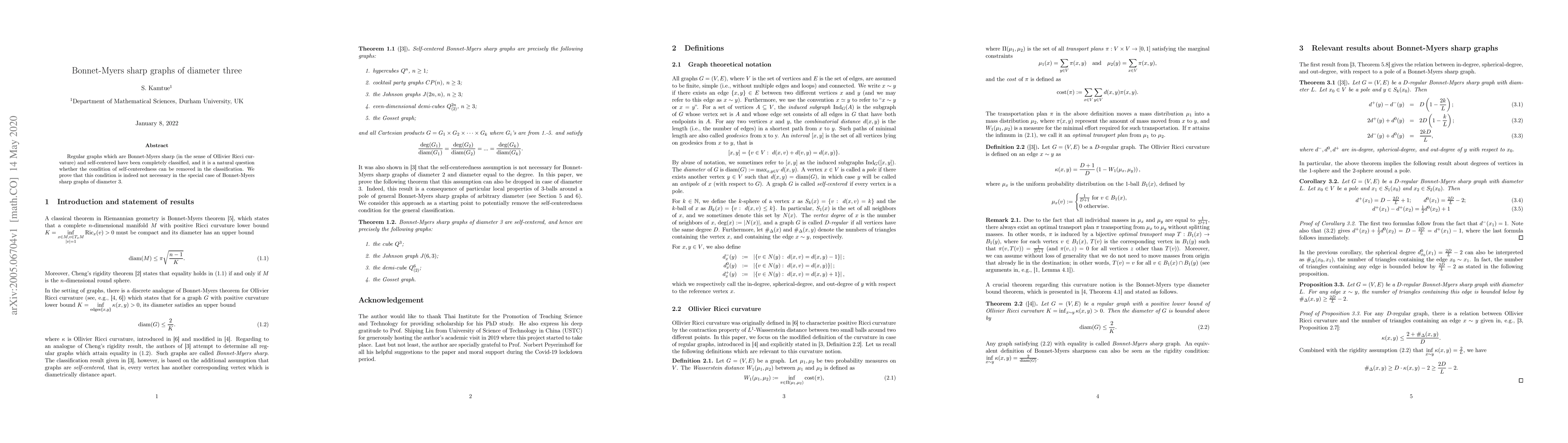 This paper classifies Bonnet-Myers sharp graphs with diameter three, demonstrating that self-centeredness is not required for this classification, thus extending the understanding of Ollivier Ricci curvature in regular graphs.