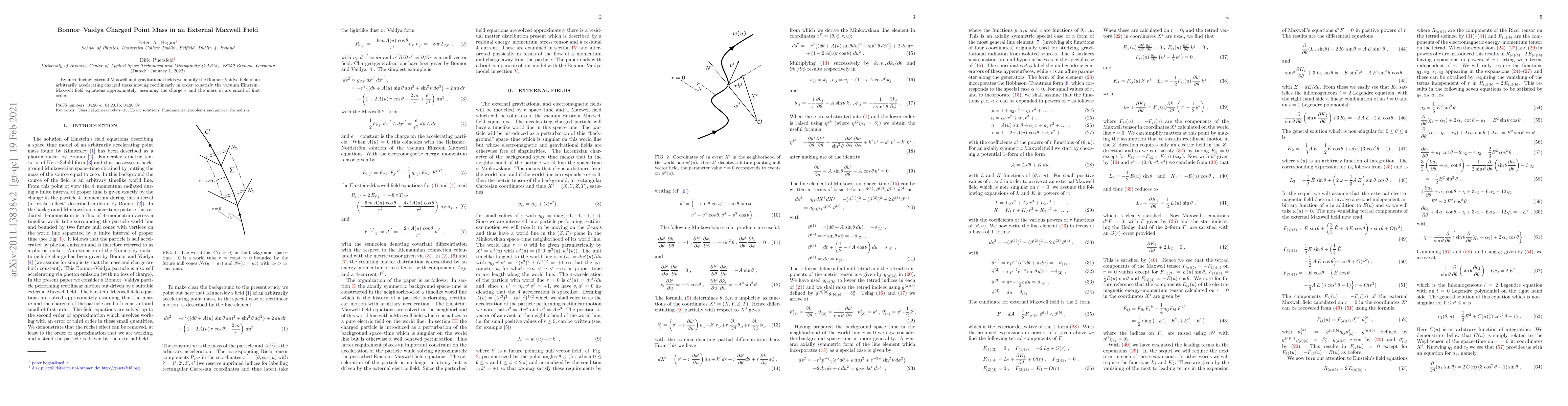 By introducing external Maxwell and gravitational fields we modify the Bonnor--Vaidya field of an arbitrarily accelerating charged mass moving rectilinearly in order to satisfy the vacuum Einstein--Maxwell field equations approximately, assuming the charge $e$ and the mass $m$ are small of first order.