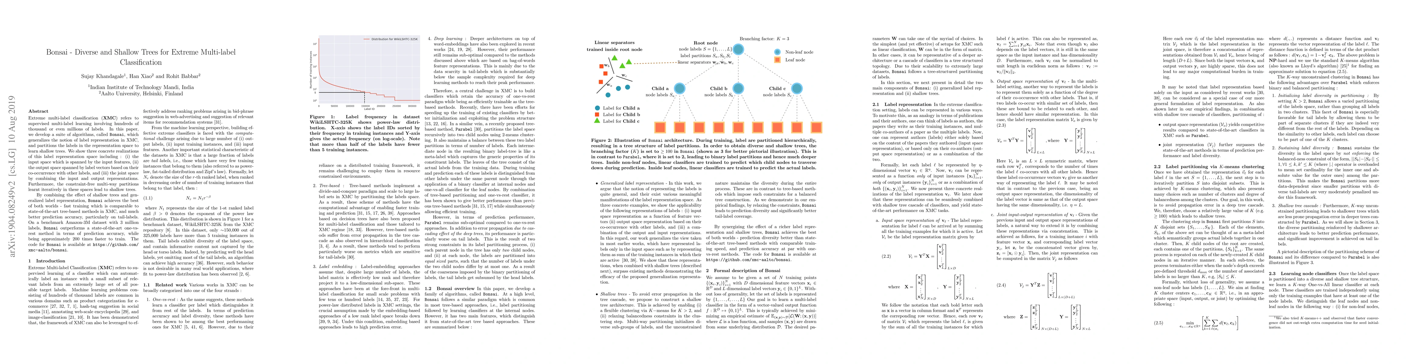 The paper introduces Bonsai, a suite of algorithms for extreme multi-label classification, which generalizes label representation and employs shallow trees for efficient learning. Bonsai achieves superior prediction accuracy, especially for tail-labels, and trains 200 times faster than state-of-the-art methods on large datasets like Amazon-3M.