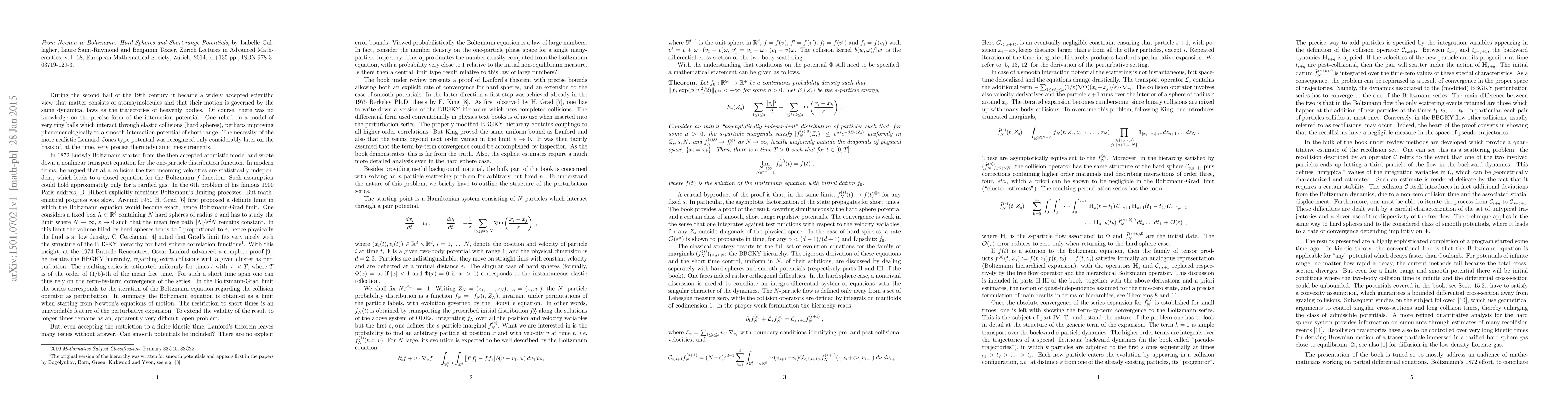 Review of From Newton to Boltzmann: Hard Spheres and Short-range Potentials, by Isabelle Gallagher, Laure Saint-Raymond and Benjamin Texier, European Mathematical Society, Z\"urich, 2014, xi+135 pp., ISBN 978-3- 03719-129-3.