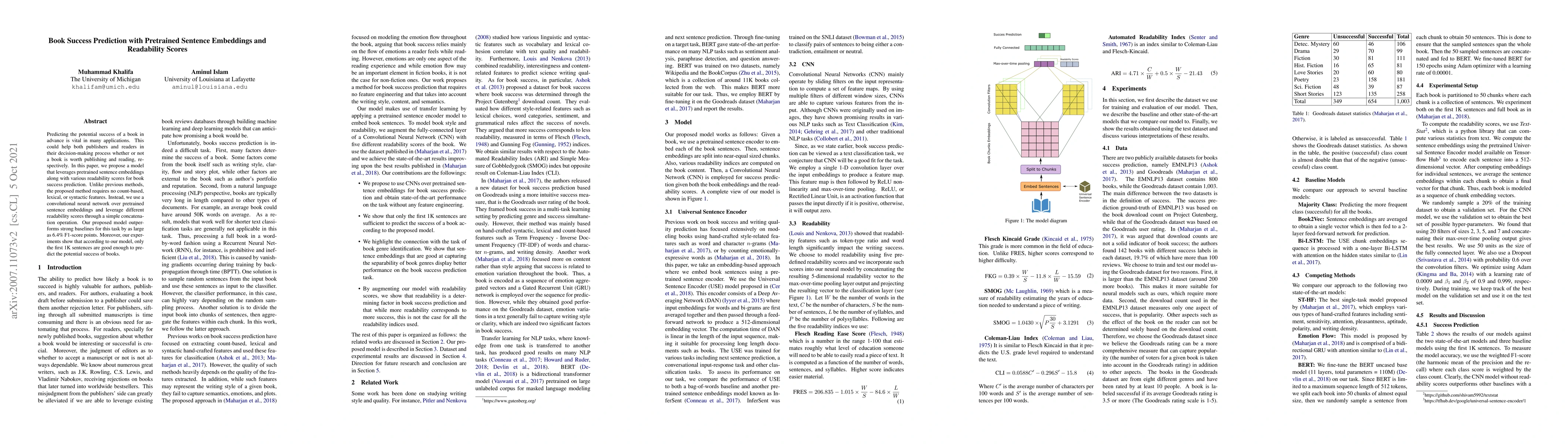 This research proposes a model using pretrained sentence embeddings and readability scores to predict book success, achieving a 6.4% F1-score improvement over baselines. The model, utilizing a convolutional neural network, requires no count-based features, only needing the first 1K sentences for effective prediction.