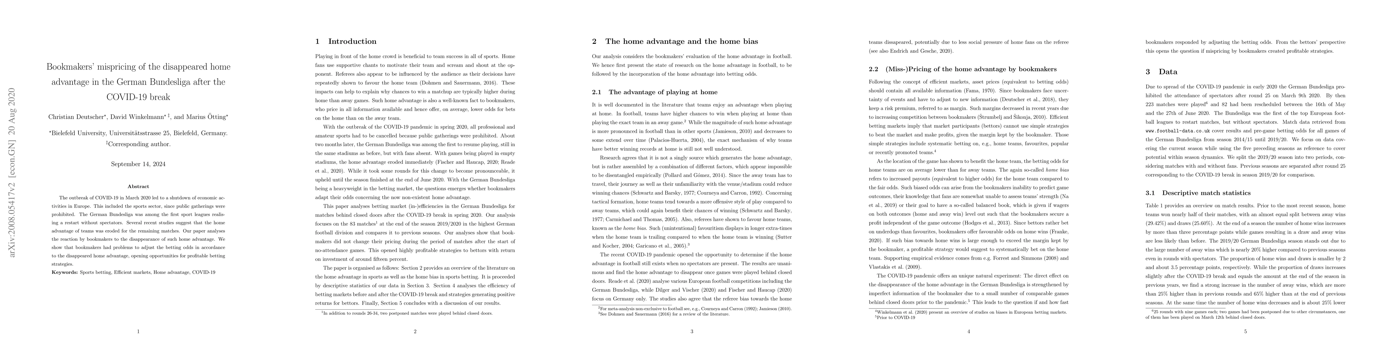 The outbreak of COVID-19 in March 2020 led to a shutdown of economic activities in Europe. This included the sports sector, since public gatherings were prohibited. The German Bundesliga was among the first sport leagues realising a restart without spectators. Several recent studies suggest that the home advantage of teams was eroded for the remaining matches. Our paper analyses the reaction by bookmakers to the disappearance of such home advantage. We show that bookmakers had problems to adjust the betting odds in accordance to the disappeared home advantage, opening opportunities for profitable betting strategies.