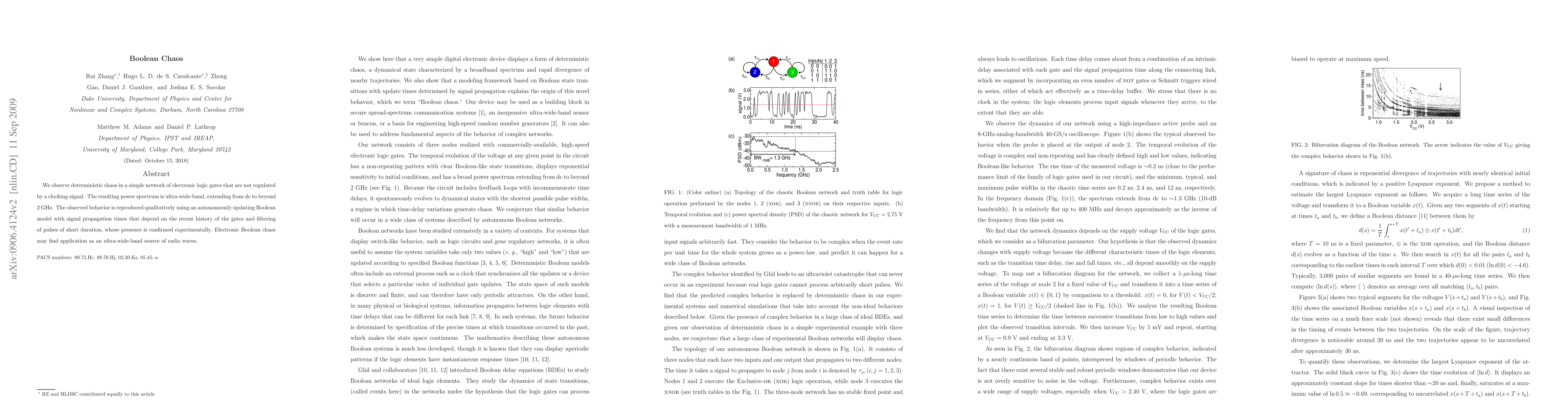 We observe deterministic chaos in a simple network of electronic logic gates that are not regulated by a clocking signal. The resulting power spectrum is ultra-wide-band, extending from dc to beyond 2 GHz. The observed behavior is reproduced qualitatively using an autonomously updating Boolean model with signal propagation times that depend on the recent history of the gates and filtering of pulses of short duration, whose presence is confirmed experimentally. Electronic Boolean chaos may find application as an ultra-wide-band source of radio waves