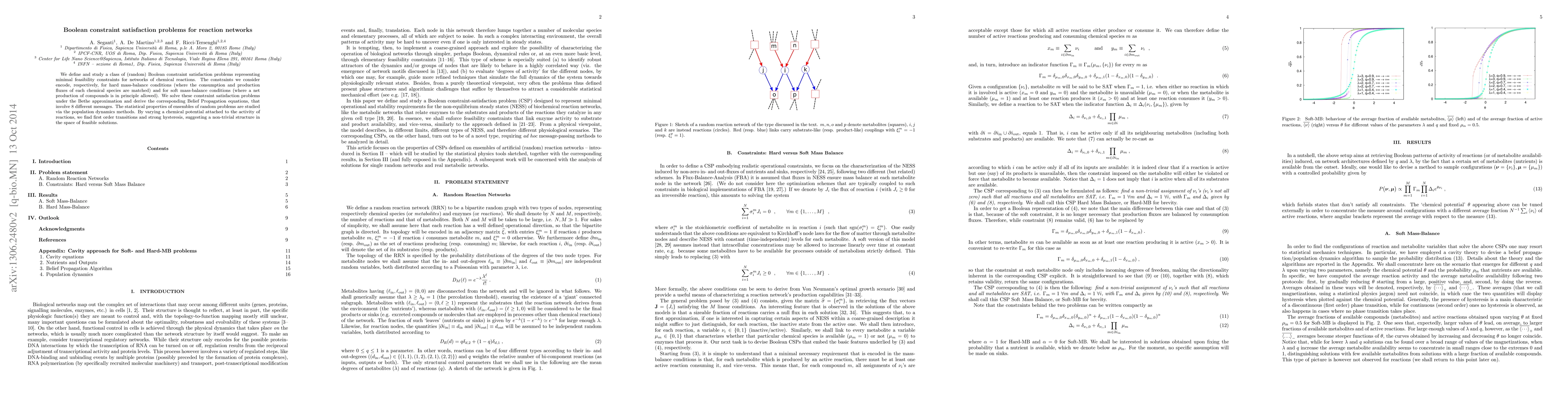 This paper defines Boolean constraint satisfaction problems to model minimal feasibility for chemical reaction networks, incorporating both hard and soft mass-balance conditions. It uses the Bethe approximation to derive Belief Propagation equations and finds first-order transitions and hysteresis by varying a chemical potential, indicating complex feasible solution structures.