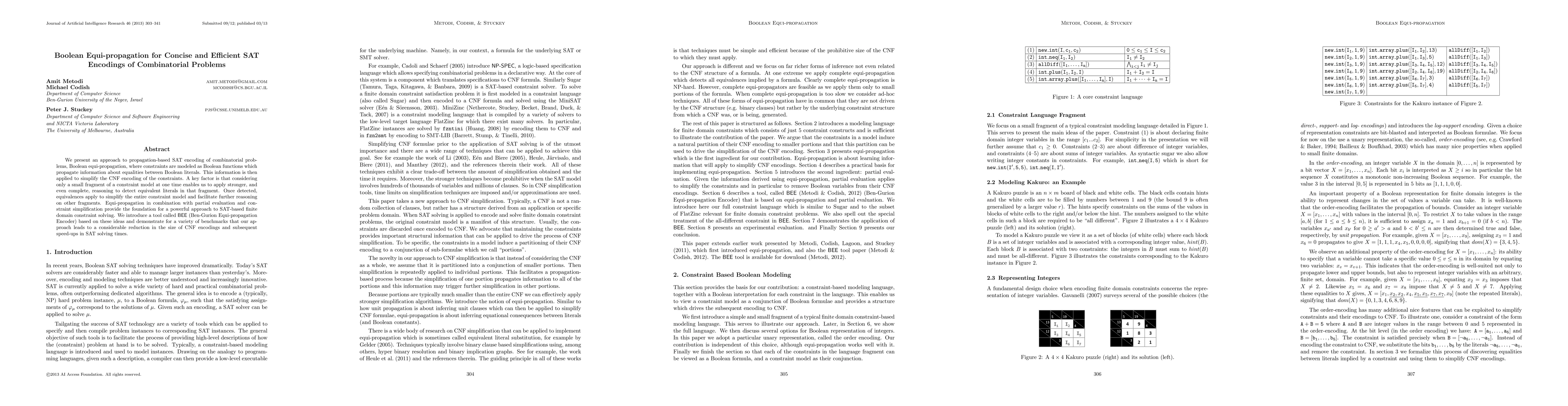 This paper introduces Boolean equi-propagation, an approach to SAT encoding that simplifies combinatorial problems by propagating information about equalities between Boolean literals to reduce CNF encoding size. The BEE tool demonstrates significant reductions in CNF size and SAT solving times.