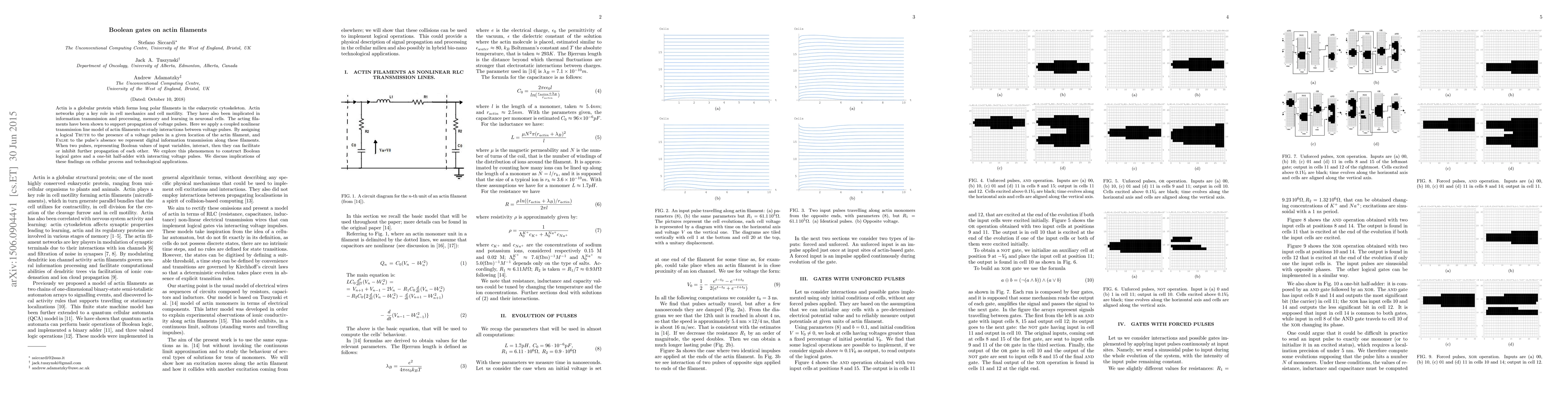 The paper presents a model for representing digital information transmission along actin filaments and demonstrates the implementation of Boolean logical gates using voltage pulse interactions.