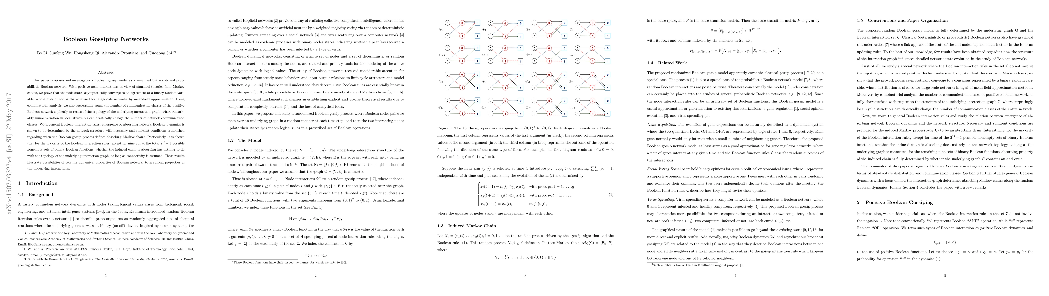 This paper proposes and investigates a Boolean gossip model as a simplified but non-trivial probabilistic Boolean network. With positive node interactions, in view of standard theories from Markov chains, we prove that the node states asymptotically converge to an agreement at a binary random variable, whose distribution is characterized for large-scale networks by mean-field approximation. Using combinatorial analysis, we also successfully count the number of communication classes of the positive Boolean network explicitly in terms of the topology of the underlying interaction graph, where remarkably minor variation in local structures can drastically change the number of network communication classes. With general Boolean interaction rules, emergence of absorbing network Boolean dynamics is shown to be determined by the network structure with necessary and sufficient conditions established regarding when the Boolean gossip process defines absorbing Markov chains. Particularly, it is shown that for the majority of the Boolean interaction rules, except for nine out of the total $2^{16}-1$ possible nonempty sets of binary Boolean functions, whether the induced chain is absorbing has nothing to do with the topology of the underlying interaction graph, as long as connectivity is assumed. These results illustrate possibilities of {relating dynamical} properties of Boolean networks to graphical properties of the underlying interactions.