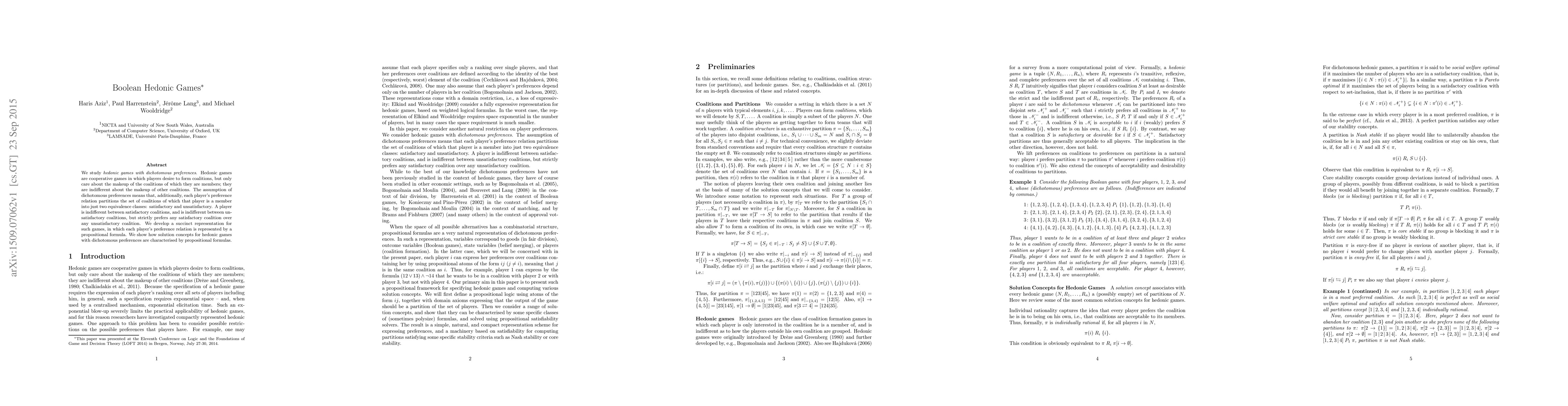 We study hedonic games with dichotomous preferences. Hedonic games are cooperative games in which players desire to form coalitions, but only care about the makeup of the coalitions of which they are members; they are indifferent about the makeup of other coalitions. The assumption of dichotomous preferences means that, additionally, each player's preference relation partitions the set of coalitions of which that player is a member into just two equivalence classes: satisfactory and unsatisfactory. A player is indifferent between satisfactory coalitions, and is indifferent between unsatisfactory coalitions, but strictly prefers any satisfactory coalition over any unsatisfactory coalition. We develop a succinct representation for such games, in which each player's preference relation is represented by a propositional formula. We show how solution concepts for hedonic games with dichotomous preferences are characterised by propositional formulas.