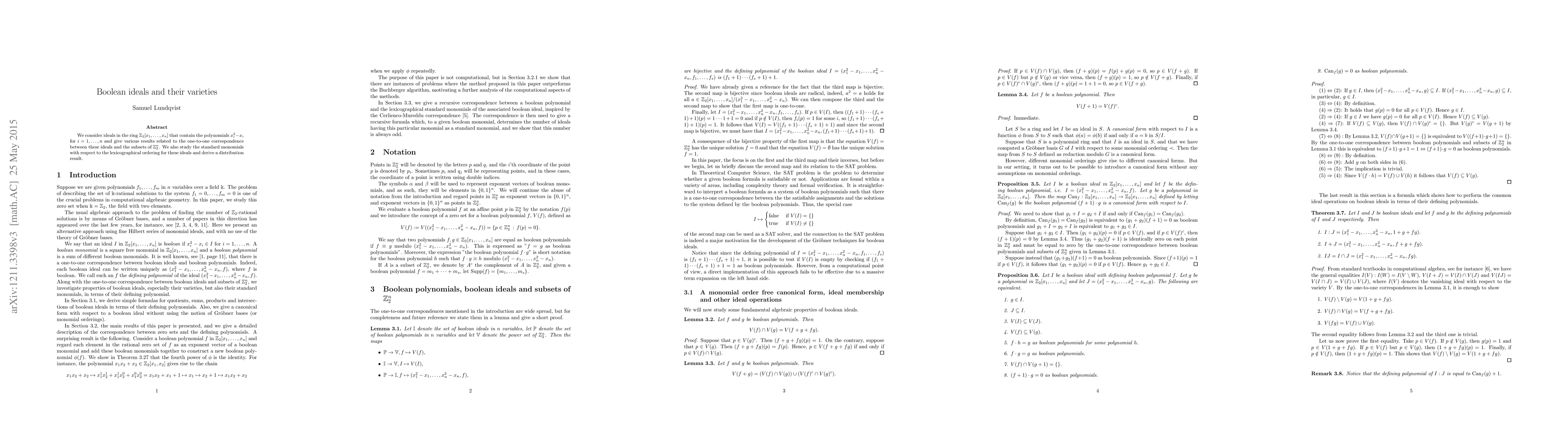We consider ideals in the ring $\mathbb{Z}_2[x_1,\ldots, x_n]$ that contain the polynomials $x_i^2 - x_i$ for $i = 1, \ldots, n$ and give various results related to the one-to-one correspondence between these ideals and the subsets of $\mathbb{Z}_2^n$. We also study the standard monomials with respect to the lexicographical ordering for these ideals and derive a distribution result.