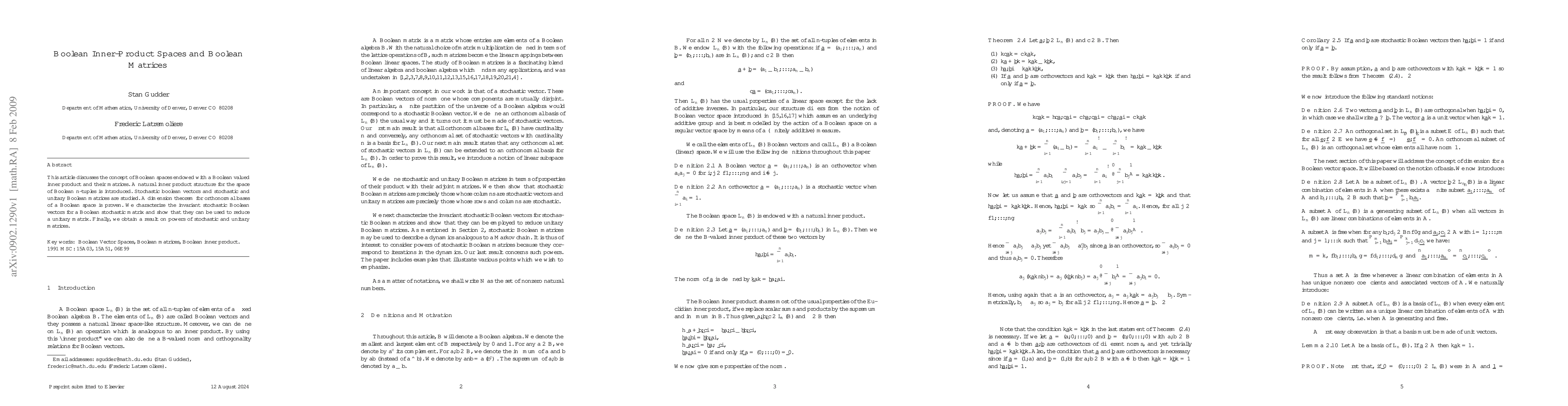 This paper introduces Boolean inner product spaces and explores Boolean matrices, proving a dimension theorem for orthonormal bases and characterizing invariant stochastic Boolean vectors for Boolean stochastic matrices, which can reduce unitary matrices. Additionally, it presents results on the powers of stochastic and unitary matrices.