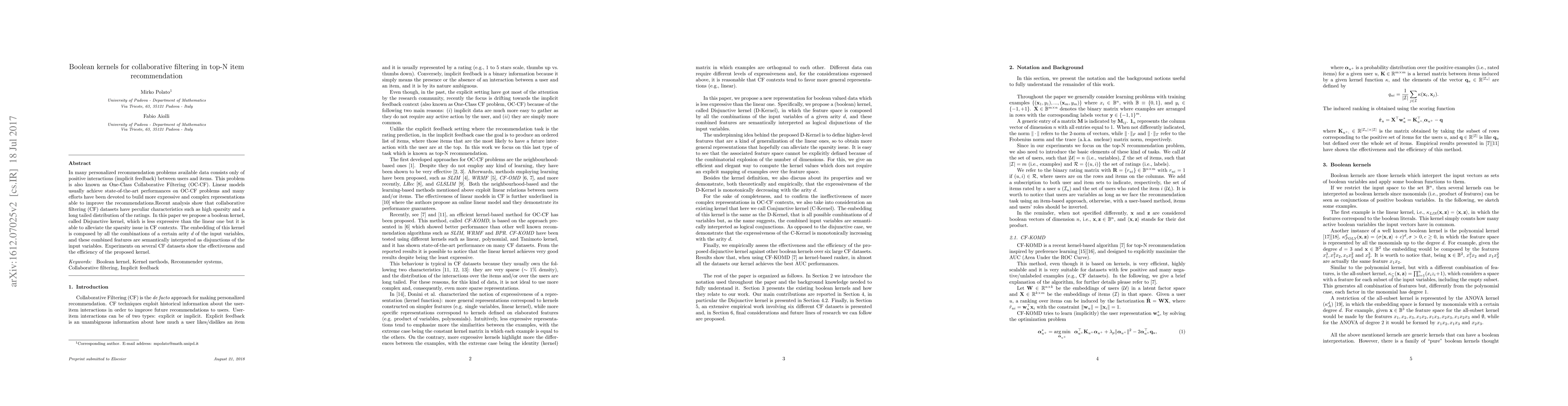 This paper proposes a Disjunctive kernel, a boolean kernel for One-Class Collaborative Filtering, to address the sparsity issue in recommendation datasets. The kernel's embeddings, composed of combinations of input variables, interpret features as disjunctions, demonstrating effectiveness and efficiency in experiments on various CF datasets.
