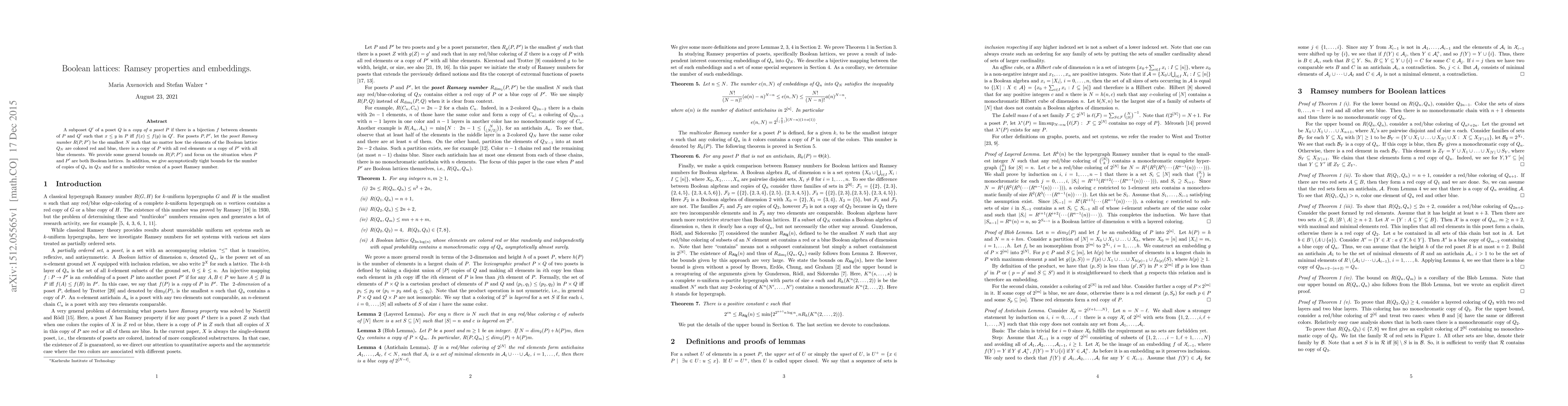 A subposet $Q'$ of a poset $Q$ is a copy of a poset $P$ if there is a bijection $f$ between elements of $P$ and $Q'$ such that $x\leq y$ in $P$ iff $f(x)\leq f(y)$ in $Q'$. For posets $P, P'$, let the poset Ramsey number $R(P,P')$ be the smallest $N$ such that no matter how the elements of the Boolean lattice $Q_N$ are colored red and blue, there is a copy of $P$ with all red elements or a copy of $P'$ with all blue elements. We provide some general bounds on $R(P,P')$ and focus on the situation when $P$ and $P'$ are both Boolean lattices. In addition, we give asymptotically tight bounds for the number of copies of $Q_n$ in $Q_N$ and for a multicolor version of a poset Ramsey number.