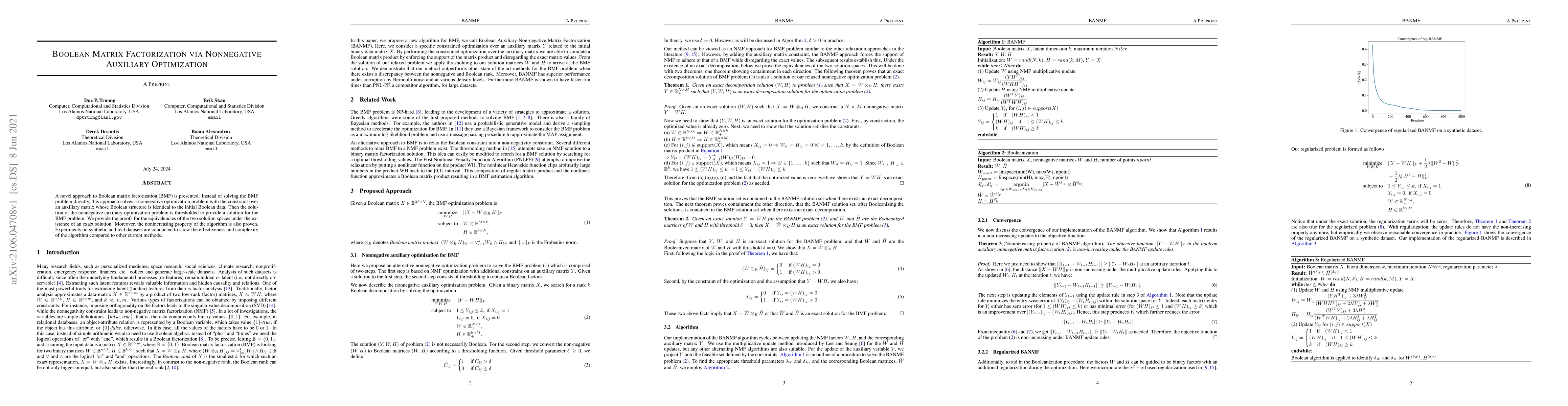The paper introduces a new method for Boolean matrix factorization (BMF) by solving a nonnegative optimization problem with an auxiliary matrix, then thresholding its solution to yield BMF results. The approach's equivalence and nonincreasing properties are proven, and experiments demonstrate its effectiveness and complexity compared to existing methods.