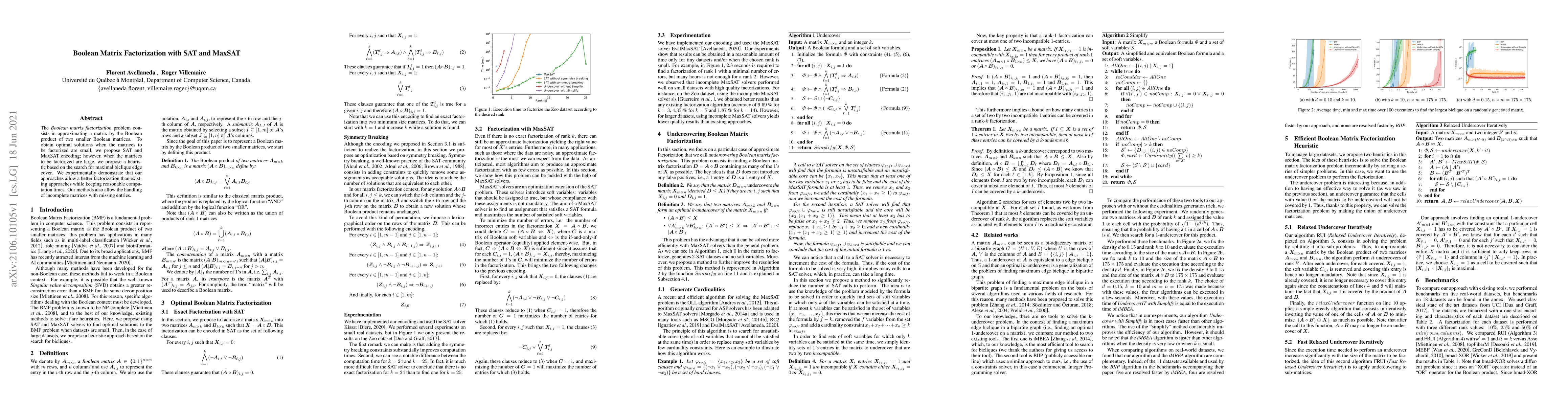 This paper proposes SAT and MaxSAT encoding for optimal Boolean matrix factorization of small matrices, and a heuristic method for large matrices based on maximal biclique edge cover. Experimental results show improved factorization quality over existing methods with manageable computation times, and the ability to handle incomplete matrices.