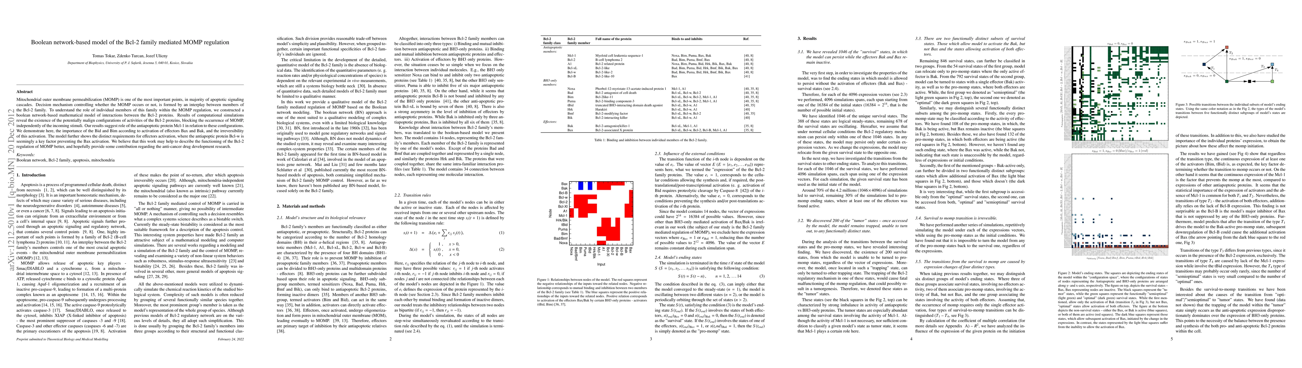 Mitochondrial outer membrane permeabilization (MOMP) is one of the most important points, in majority of apoptotic signaling cascades. Decision mechanism controlling whether the MOMP occurs or not, is formed by an interplay between members of the Bcl-2 family. To understand the role of individual members of this family within the MOMP regulation, we constructed a boolean network-based mathematical model of interactions between the Bcl-2 proteins. Results of computational simulations reveal the existence of the potentially malign configurations of activities of the Bcl-2 proteins, blocking the occurrence of MOMP, independently of the incoming stimuli. Our results suggest role of the antiapoptotic protein Mcl-1 in relation to these configurations. We demonstrate here, the importance of the Bid and Bim according to activation of effectors Bax and Bak, and the irreversibility of this activation. The model further shows the distinct requirements for effectors activation, where the antiapoptic protein Bcl-w is seemingly a key factor preventing the Bax activation. We believe that this work may help to describe the functioning of the Bcl-2 regulation of MOMP better, and hopefully provide some contribution regarding the anti-cancer drug development research.