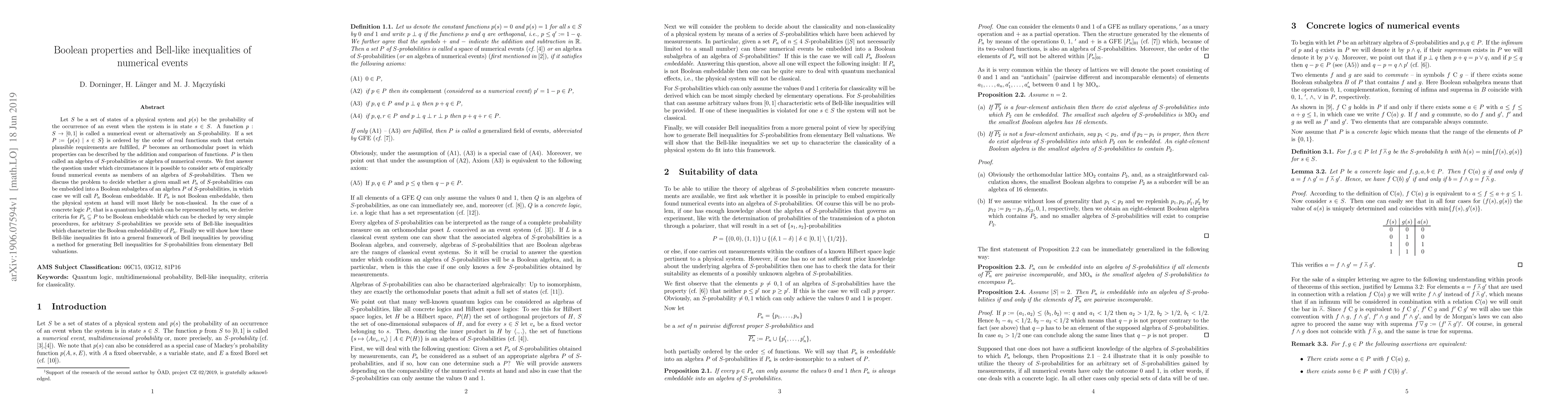 Let S be a set of states of a physical system and p(s) be the probability of the occurrence of an event when the system is in state s. A function p from S to [0,1] is called a numerical event or alternatively an S-probability. If a set P:={p(s)|s in S} is ordered by the order of real functions such that certain plausible requirements are fulfilled, P becomes an orthomodular poset in which properties can be described by the addition and comparison of functions. P is then called an algebra of S-probabilities or algebra of numerical events. We first answer the question under which circumstances it is possible to consider sets of empirically found numerical events as members of an algebra of S-probabilities. Then we discuss the problem to decide whether a given small set Pn of S-probabilities can be embedded into a Boolean subalgebra of an algebra P of S-probabilities, in which case we will call Pn Boolean embeddable. If Pn is not Boolean embeddable, then the physical system at hand will most likely be non-classical. In the case of a concrete logic P, that is a quantum logic which can be represented by sets, we derive criteria for the subset Pn of P to be Boolean embeddable which can be checked by very simple procedures, for arbitrary S-probabilities we provide sets of Bell-like inequalities which characterize the Boolean embeddability of Pn. Finally we will show how these Bell-like inequalities fit into a general framework of Bell inequalities by providing a method for generating Bell inequalities for S-probabilities from elementary Bell valuations.