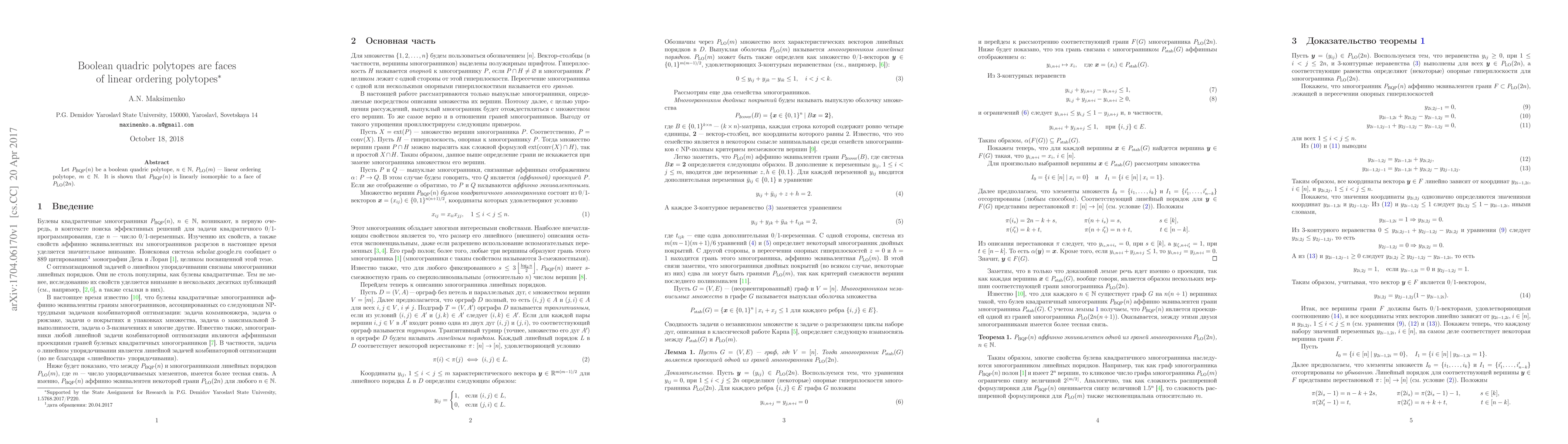 Let $BQP(n)$ be a boolean quadric polytope, $LOP(m)$ be a linear ordering polytope. It is shown that $BQP(n)$ is linearly isomorphic to a face of $LOP(2n)$.