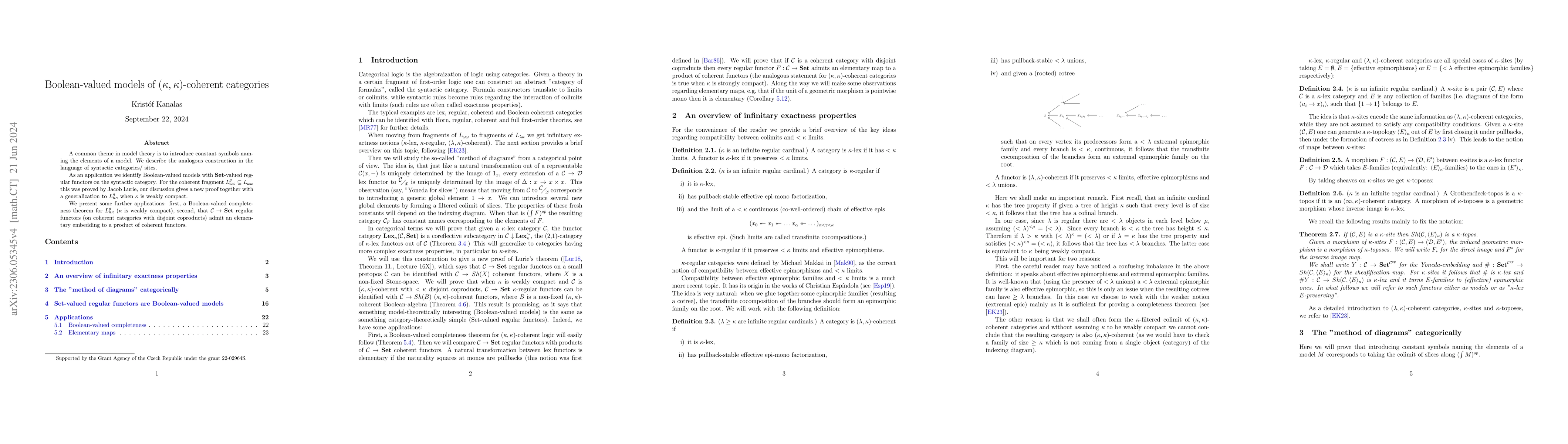 A common theme in model theory is to introduce constant symbols naming the elements of a model. We describe the analogous construction in the language of syntactic categories/ sites. As an application we identify Boolean-valued models with $\mathbf{Set}$-valued regular functors on the syntactic category. For the coherent fragment $L_{\omega \omega }^g \subseteq L_{\omega \omega }$ this was proved by Jacob Lurie, our discussion gives a new proof together with a generalization to $L_{\kappa \kappa }^g$ when $\kappa $ is weakly compact. We present some further applications: first, a Boolean-valued completeness theorem for $L_{\kappa \kappa }^g$ ($\kappa $ is weakly compact), second, that $\mathcal{C}\to \mathbf{Set} $ regular functors (on coherent categories with disjoint coproducts) admit an elementary embedding to a product of coherent functors.