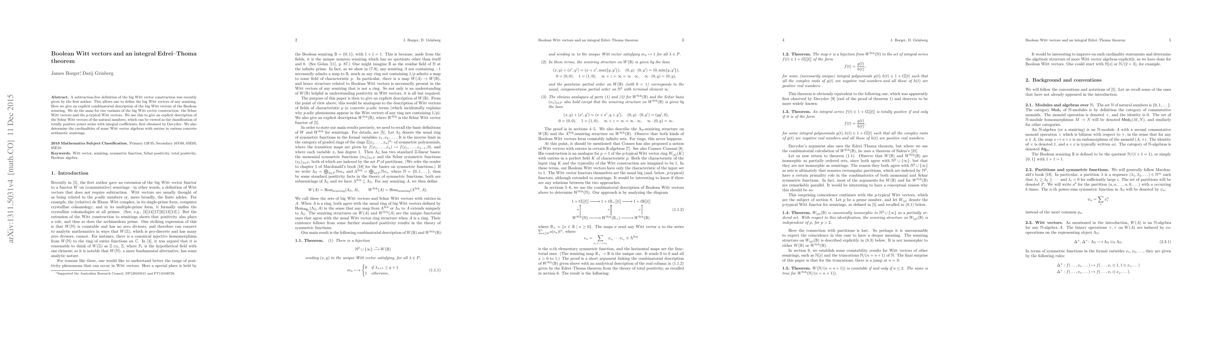 This paper provides a combinatorial description of the big Witt vectors for the Boolean semiring, along with Schur Witt vectors and $p$-typical Witt vectors, and determines the cardinalities of some Witt vector algebras over concrete arithmetic semirings, leading to the classification of totally positive power series with integral coefficients.