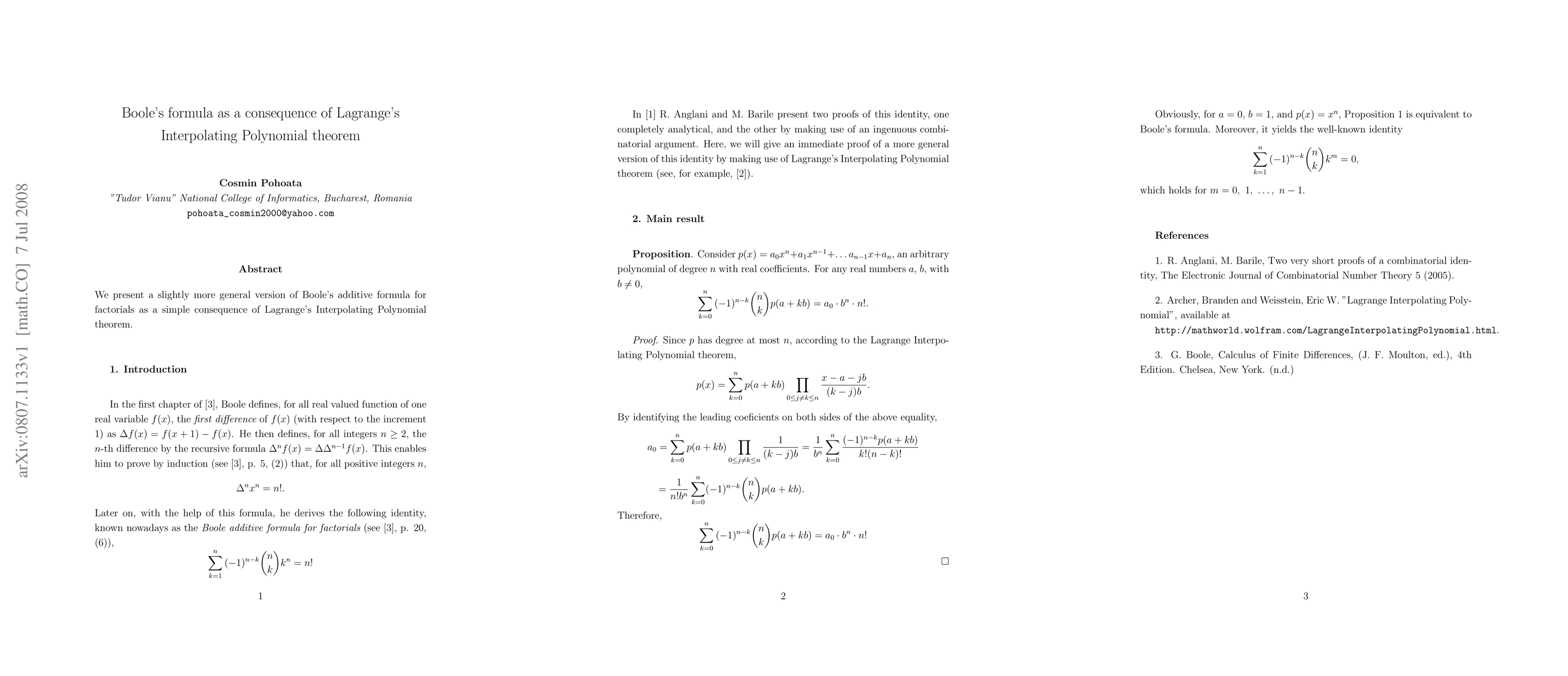 A paper proves Boole's formula for factorials as a consequence of Lagrange's Interpolating Polynomial theorem, providing a simpler explanation of the mathematical relationship.