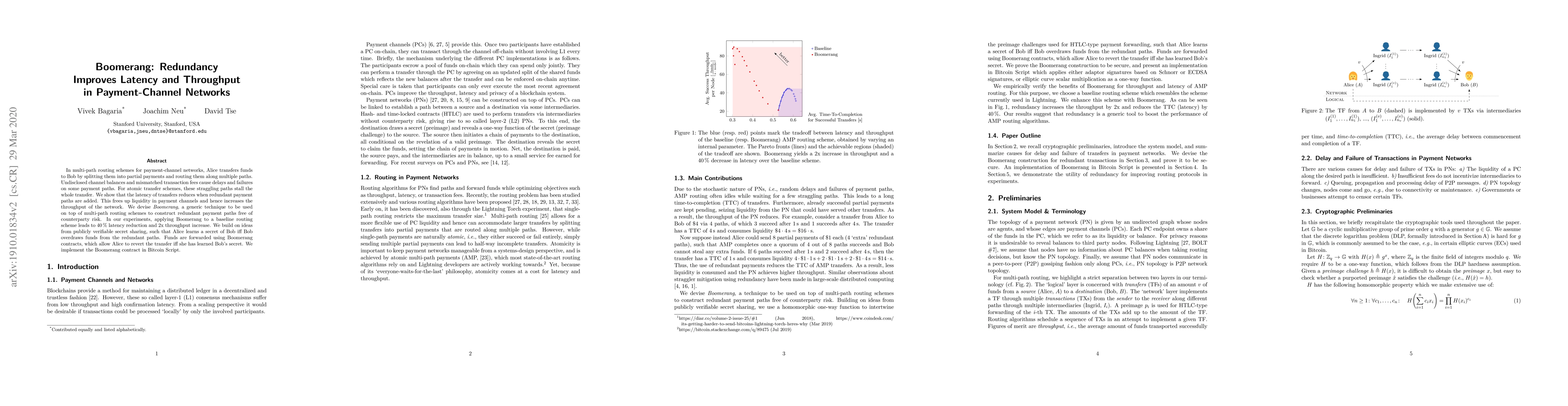 Boomerang introduces a technique to reduce latency and increase throughput in payment-channel networks by adding redundant payment paths, thereby mitigating delays caused by undisclosed channel balances and mismatched transaction fees. This method, implemented via Boomerang contracts in Bitcoin Script, achieves a 40% reduction in latency and doubles throughput.