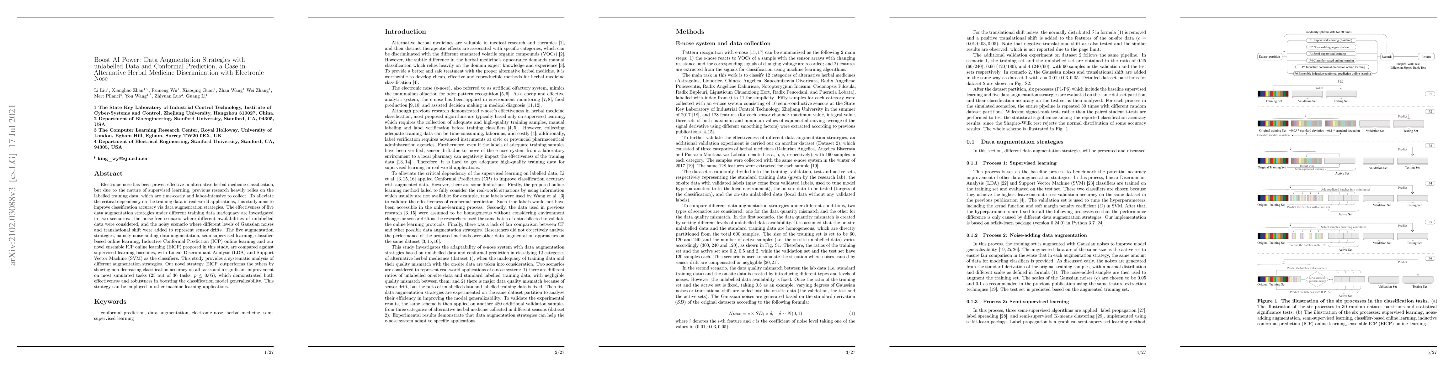 This paper explores data augmentation strategies to enhance classification accuracy using an electronic nose for alternative herbal medicine discrimination, minimizing reliance on costly labelled data. The study compares five augmentation techniques, including a novel ensemble Inductive Conformal Prediction, showing that it significantly outperforms others in various scenarios, thereby boosting model generalizability.