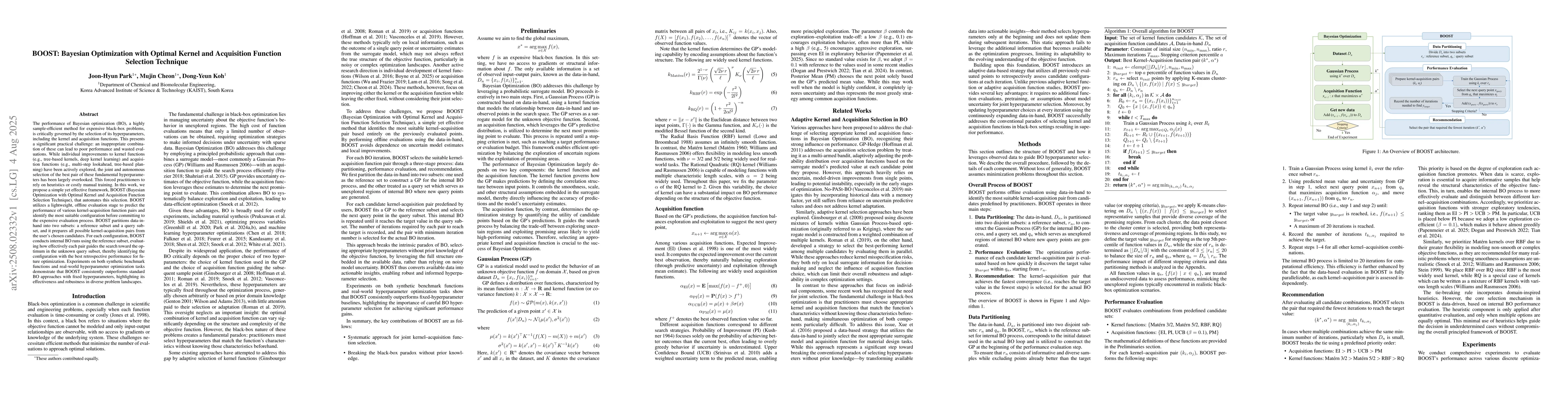 The performance of Bayesian optimization (BO), a highly sample-efficient method for expensive black-box problems, is critically governed by the selection of its hyperparameters, including the kernel and acquisition functions. This presents a challenge: an inappropriate combination of these can lead to poor performance and wasted evaluations. While individual improvements to kernel functions (e.g., tree-based kernels, deep kernel learning) and acquisition functions (e.g., multi-step lookahead, tree-based planning) have been explored, the joint and autonomous selection of the best pair of these fundamental hyperparameters has been overlooked. This forces practitioners to rely on heuristics or costly manual training. We propose a simple yet effective framework, BOOST (Bayesian Optimization with Optimal Kernel and Acquisition Function Selection Technique), that automates this selection. BOOST utilizes a lightweight, offline evaluation stage to predict the performance of various kernel-acquisition function pairs and identify the most suitable configuration before expensive evaluations. BOOST partitions data-in-hand into two subsets: a reference subset and a query subset, and it prepares all possible kernel-acquisition pairs from the user's chosen candidates. For each configuration, BOOST conducts internal BO runs using the reference subset, evaluating how effectively each pair guides the search toward the optimum in the unknown query subset, thereby identifying the configuration with the best retrospective performance for future optimization. Experiments on both synthetic benchmark functions and real-world hyperparameter optimization tasks demonstrate that BOOST consistently outperforms standard BO approaches with fixed hyperparameters, highlighting its effectiveness and robustness in diverse problem landscapes.