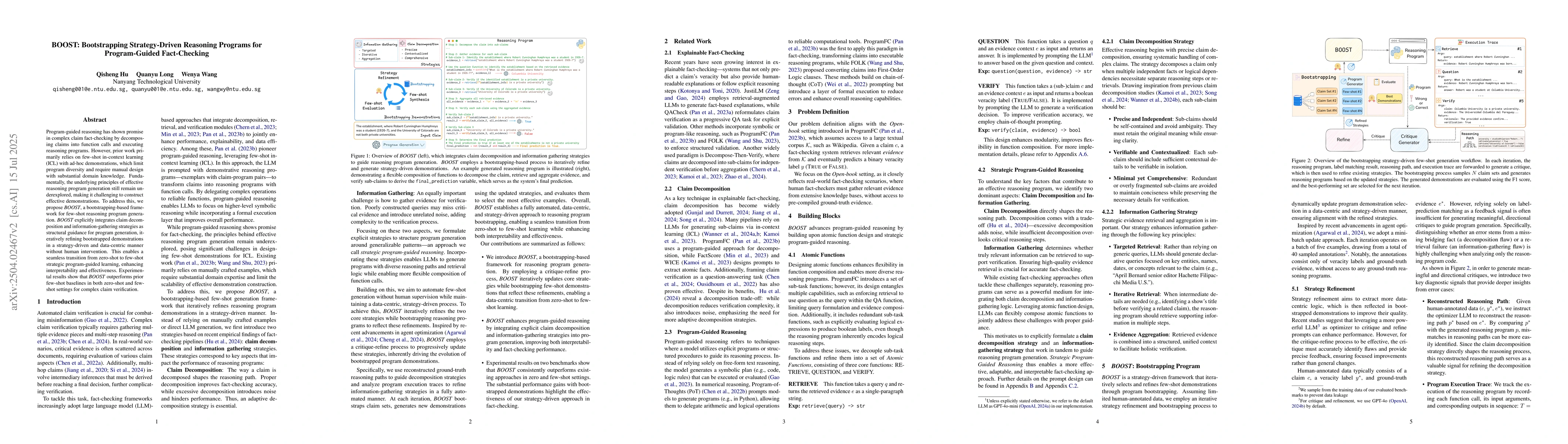 Program-guided reasoning has shown promise in complex claim fact-checking by decomposing claims into function calls and executing reasoning programs. However, prior work primarily relies on few-shot in-context learning (ICL) with ad-hoc demonstrations, which limit program diversity and require manual design with substantial domain knowledge. Fundamentally, the underlying principles of effective reasoning program generation still remain underexplored, making it challenging to construct effective demonstrations. To address this, we propose BOOST, a bootstrapping-based framework for few-shot reasoning program generation. BOOST explicitly integrates claim decomposition and information-gathering strategies as structural guidance for program generation, iteratively refining bootstrapped demonstrations in a strategy-driven and data-centric manner without human intervention. This enables a seamless transition from zero-shot to few-shot strategic program-guided learning, enhancing interpretability and effectiveness. Experimental results show that BOOST outperforms prior few-shot baselines in both zero-shot and few-shot settings for complex claim verification.