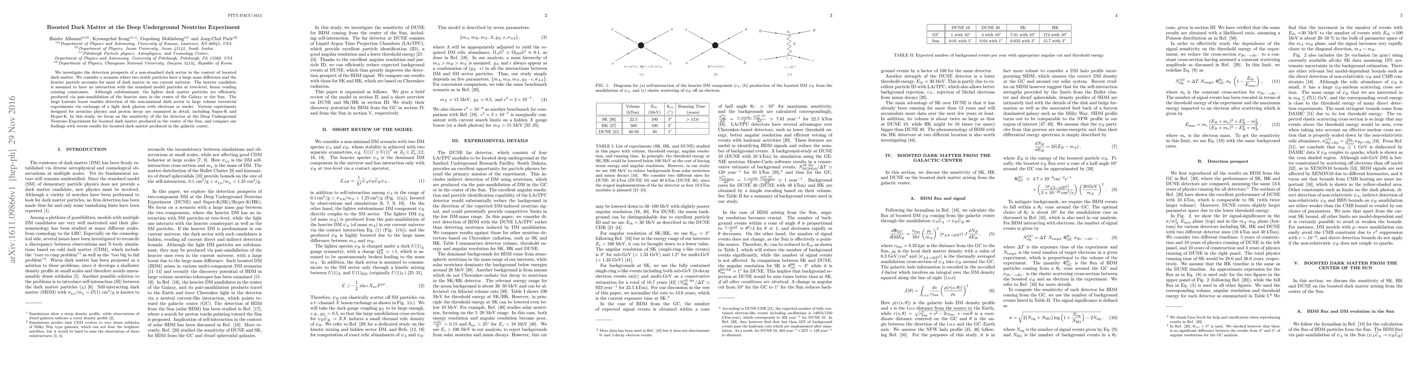 We investigate the detection prospects of a non-standard dark sector in the context of boosted dark matter. We consider a scenario where two stable particles have a large mass difference and the heavier particle accounts for most of dark matter in our current universe. The heavier candidate is assumed to have no interaction with the standard model particles at tree-level, hence evading existing constraints. Although subdominant, the lighter dark matter particles are efficiently produced via pair-annihilation of the heavier ones in the center of the Galaxy or the Sun. The large Lorentz boost enables detection of the non-minimal dark sector in large volume terrestrial experiments via exchange of a light dark photon with electrons or nuclei. Various experiments designed for neutrino physics and proton decay are examined in detail, including Super-K and Hyper-K. In this study, we focus on the sensitivity of the far detector at the Deep Underground Neutrino Experiment for boosted dark matter produced in the center of the Sun, and compare our findings with recent results for boosted dark matter produced in the galactic center.
