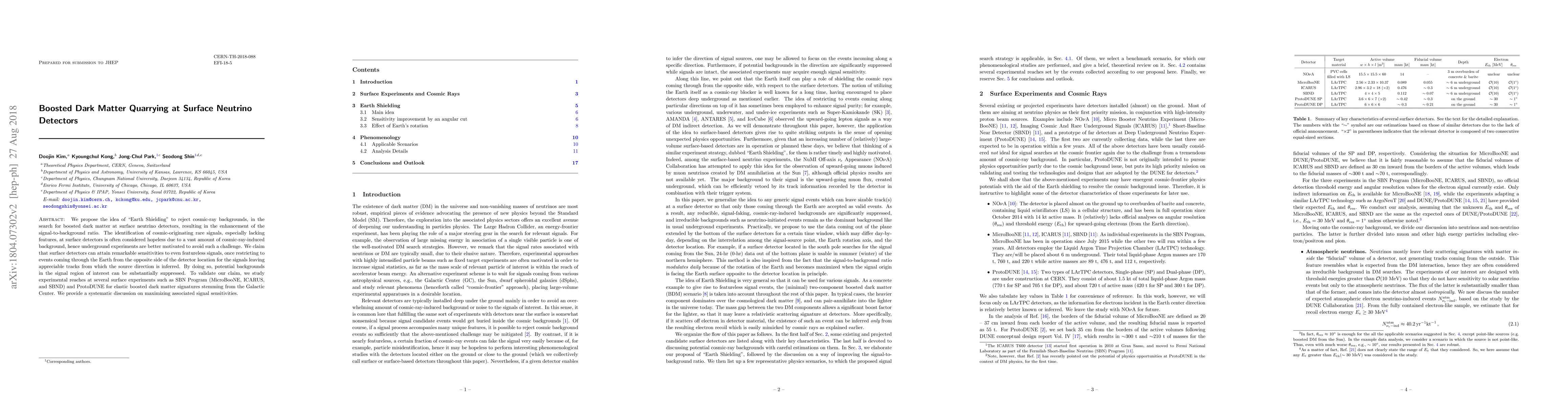This paper proposes "Earth Shielding" to enhance the detection of boosted dark matter at surface neutrino detectors by rejecting cosmic-ray backgrounds, thereby improving the signal-to-background ratio. The authors argue that surface detectors can achieve remarkable sensitivities to rare signals by focusing on events originating from the Earth's opposite side, significantly reducing potential backgrounds.