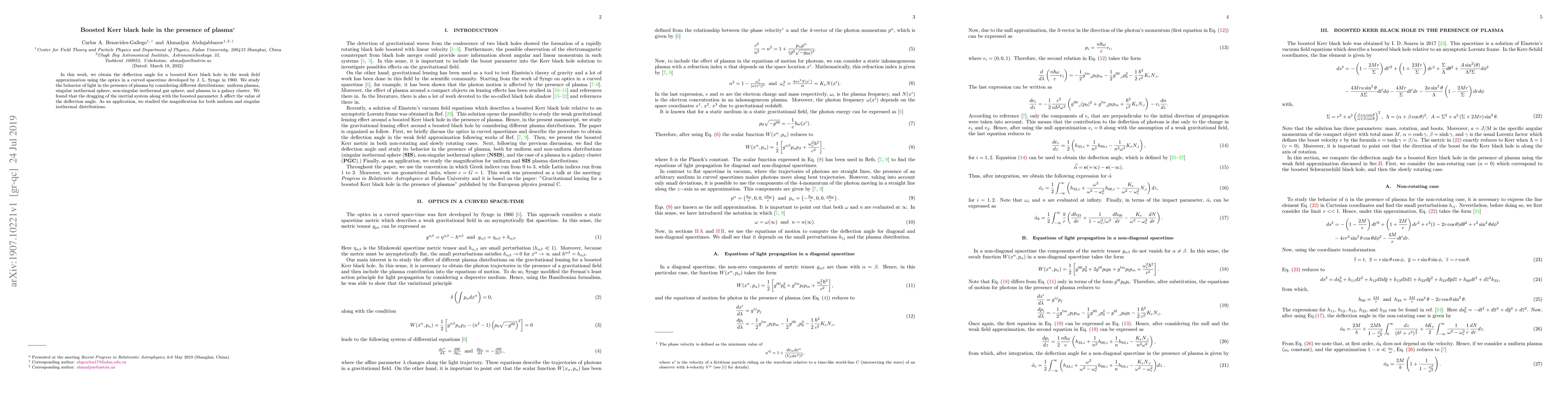 In this work, we obtain the deflection angle for a boosted Kerr black hole in the weak field approximation using the optics in a curved spacetime developed by J.L. Synge in 1960. We study the behavior of light in the presence of plasma by considering different distributions: uniform plasma, singular isothermal sphere, non-singular isothermal gas sphere, and plasma in a galaxy cluster. We found that the dragging of the inertial system along with the boosted parameter $\Lambda$ affect the value of the deflection angle. As an application, we studied the magnification for both uniform and singular isothermal distributions.