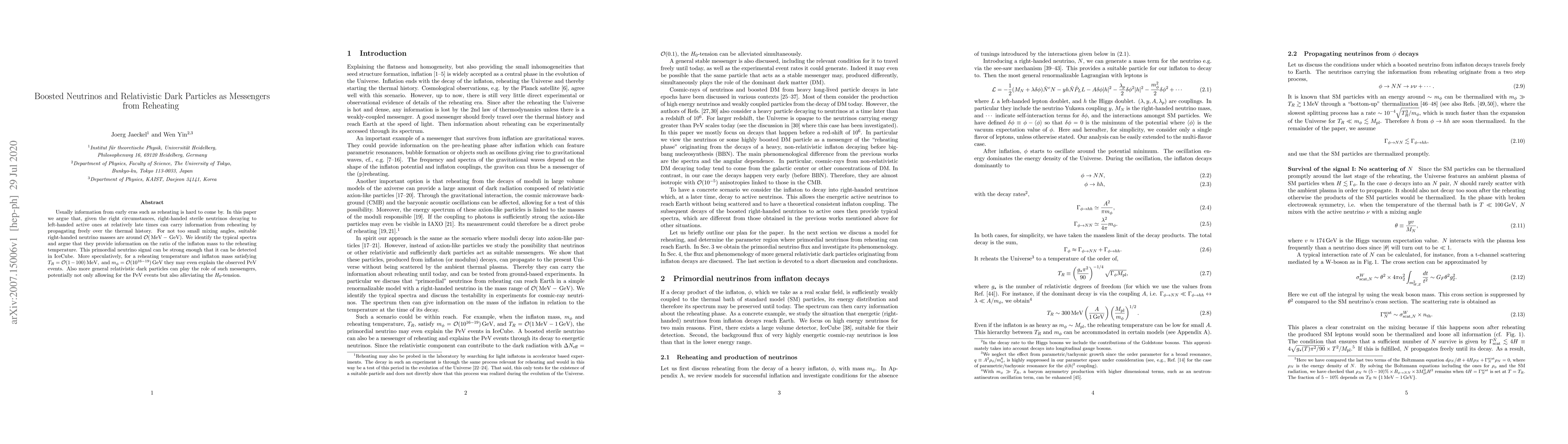 The paper introduces a new approach to utilizing boosted neutrinos and relativistic dark particles as messengers from reheating, providing a link between early universe physics and observable consequences in neutrino detectors.
