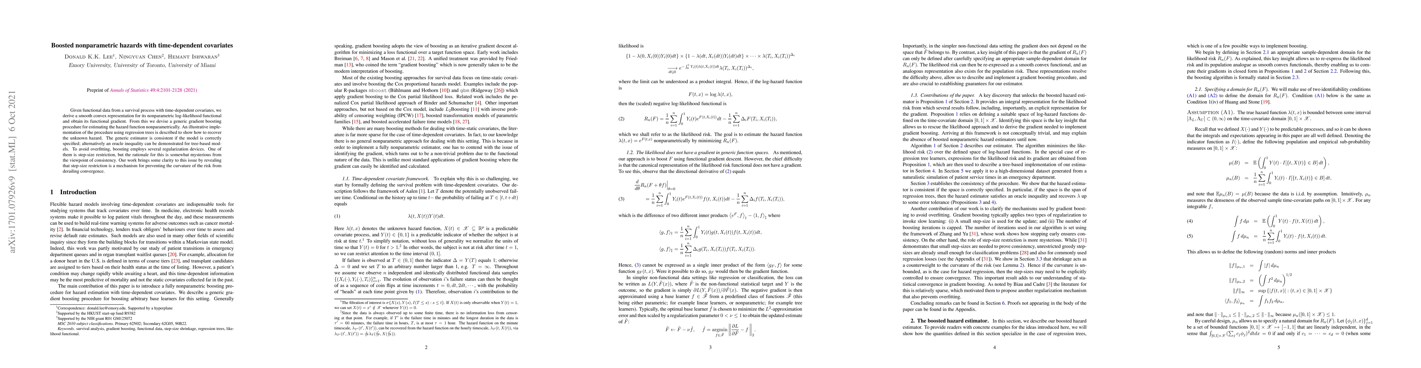 This paper develops a gradient boosting method for nonparametric hazard estimation with time-dependent covariates, providing a smooth convex representation of the log-likelihood functional. The method employs regularization techniques, including step-size restriction, to prevent overfitting and ensure convergence, clarifying the role of step-size in maintaining consistency.