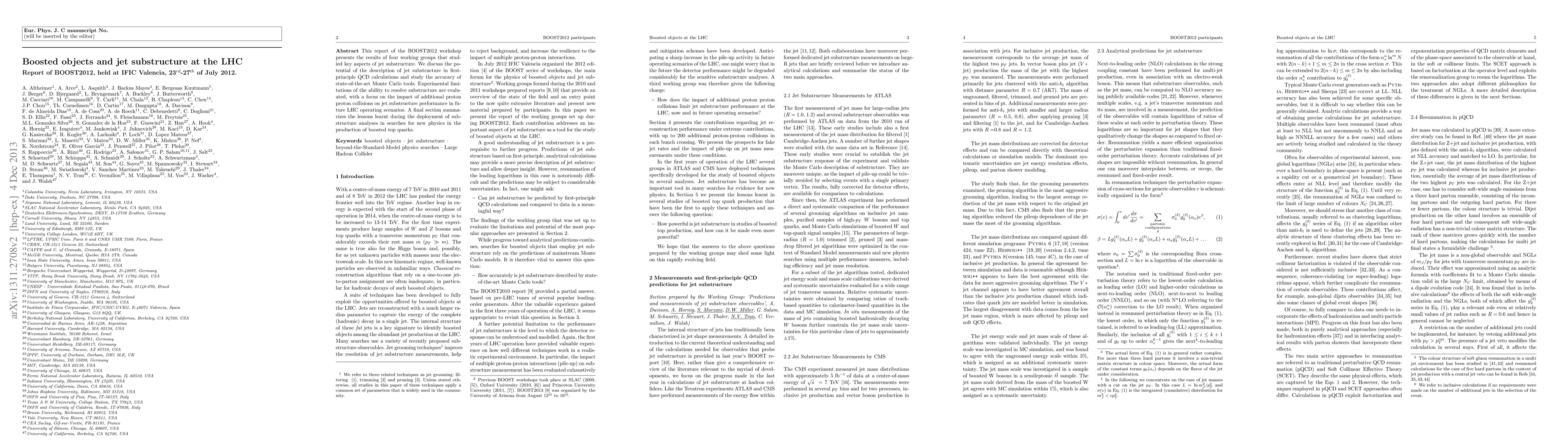 This report from the BOOST2012 workshop evaluates jet substructure techniques in LHC experiments, focusing on the accuracy of QCD calculations and Monte Carlo tools, and assesses experimental limitations, especially in future LHC scenarios. It also summarizes insights gained from substructure analyses in searches for new physics involving boosted top quarks.