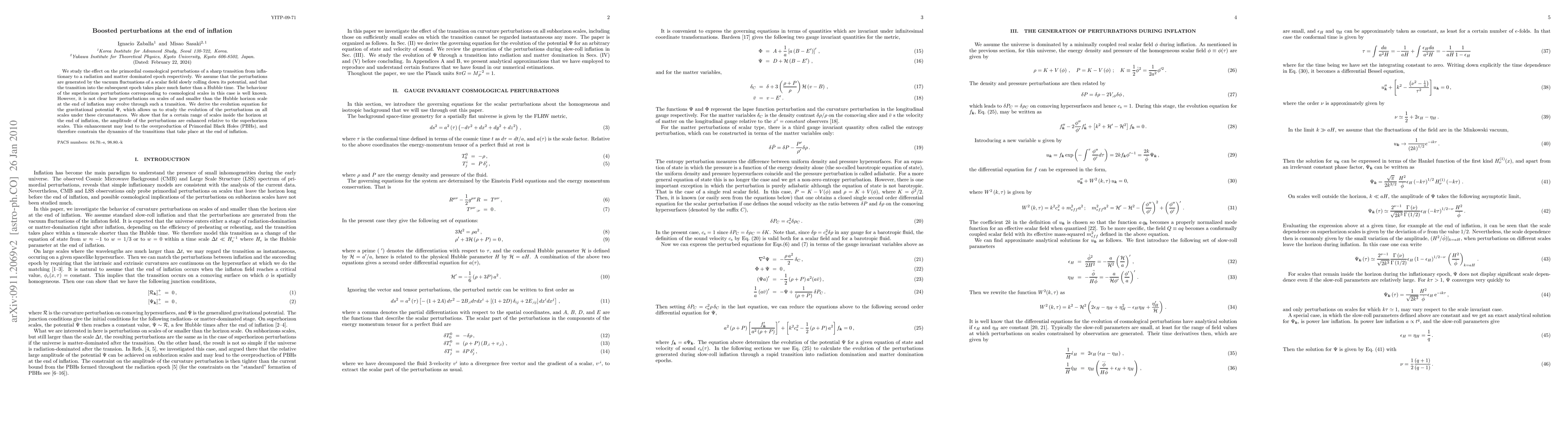 We study the effect on the primordial cosmological perturbations of a sharp transition from inflationary to a radiation and matter dominated epoch respectively. We assume that the perturbations are generated by the vacuum fluctuations of a scalar field slowly rolling down its potential, and that the transition into the subsequent epoch takes place much faster than a Hubble time. The behaviour of the superhorizon perturbations corresponding to cosmological scales in this case is well known. However, it is not clear how perturbations on scales of and smaller than the Hubble horizon scale at the end of inflation may evolve through such a transition. We derive the evolution equation for the gravitational potential $\Psi$, which allows us to study the evolution of the perturbations on all scales under these circumstances. We show that for a certain range of scales inside the horizon at the end of inflation, the amplitude of the perturbations are enhanced relative to the superhorizon scales. This enhancement may lead to the overproduction of Primordial Black Holes (PBHs), and therefore constrain the dynamics of the transitions that take place at the end of inflation.