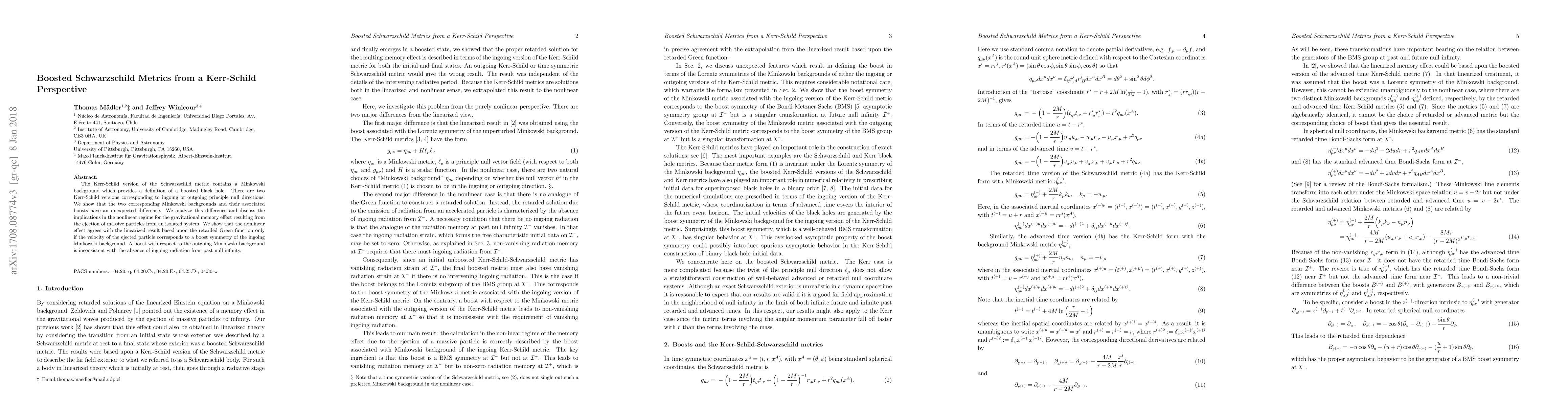 The Kerr-Schild version of the Schwarzschild metric contains a Minkowski background which provides a definition of a boosted black hole. There are two Kerr-Schild versions corresponding to ingoing or outgoing principle null directions. We show that the two corresponding Minkowski backgrounds and their associated boosts have an unexpected difference. We analyze this difference and discuss the implications in the nonlinear regime for the gravitational memory effect resulting from the ejection of massive particles from an isolated system. We show that the nonlinear effect agrees with the linearized result based upon the retarded Green function only if the velocity of the ejected particle corresponds to a boost symmetry of the ingoing Minkowski background. A boost with respect to the outgoing Minkowski background is inconsistent with the absence of ingoing radiation from past null infinity.