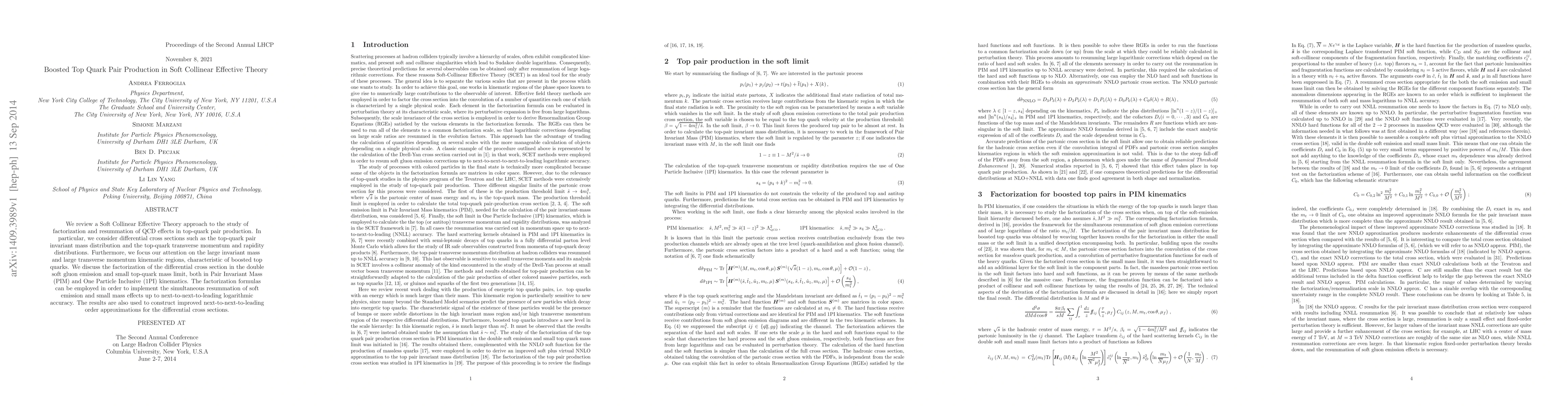 We review a Soft Collinear Effective Theory approach to the study of factorization and resummation of QCD effects in top-quark pair production. In particular, we consider differential cross sections such as the top-quark pair invariant mass distribution and the top-quark transverse momentum and rapidity distributions. Furthermore, we focus our attention on the large invariant mass and large transverse momentum kinematic regions, characteristic of boosted top quarks. We discuss the factorization of the differential cross section in the double soft gluon emission and small top-quark mass limit, both in Pair Invariant Mass (PIM) and One Particle Inclusive (1PI) kinematics. The factorization formulas can be employed in order to implement the simultaneous resummation of soft emission and small mass effects up to next-to-next-to-leading logarithmic accuracy. The results are also used to construct improved next-to-next-to-leading order approximations for the differential cross sections.