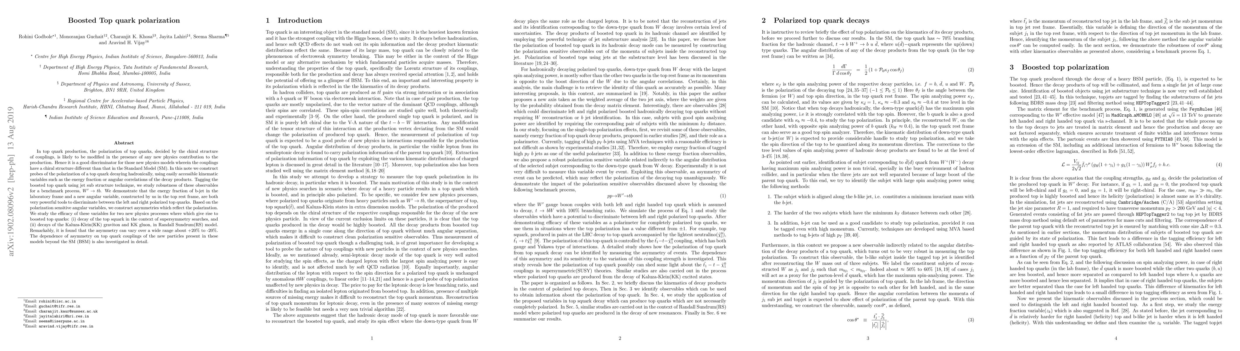 This paper investigates the polarization of boosted top quarks in the presence of new physics, proposing kinematic variables to distinguish between left and right polarizations. It demonstrates that energy fraction of b-jets and a novel angular variable are effective in discriminating polarizations, and studies their efficiency in supersymmetry and Randall-Sundrum model scenarios, finding asymmetries that vary significantly with new physics contributions.