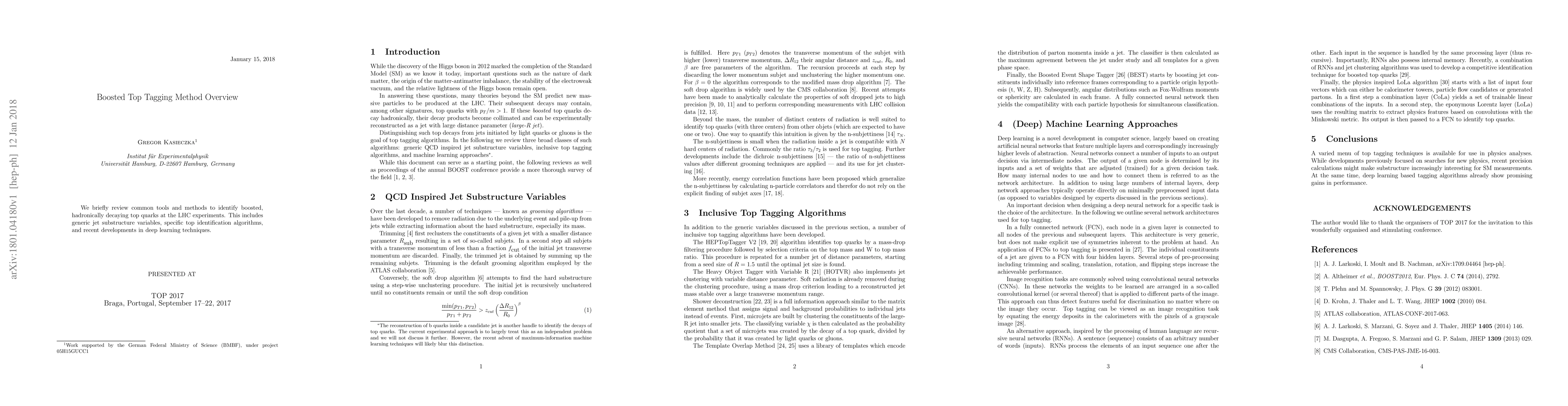 Researchers review tools and methods for identifying boosted top quarks at LHC experiments, including generic jet substructure variables and deep learning techniques.