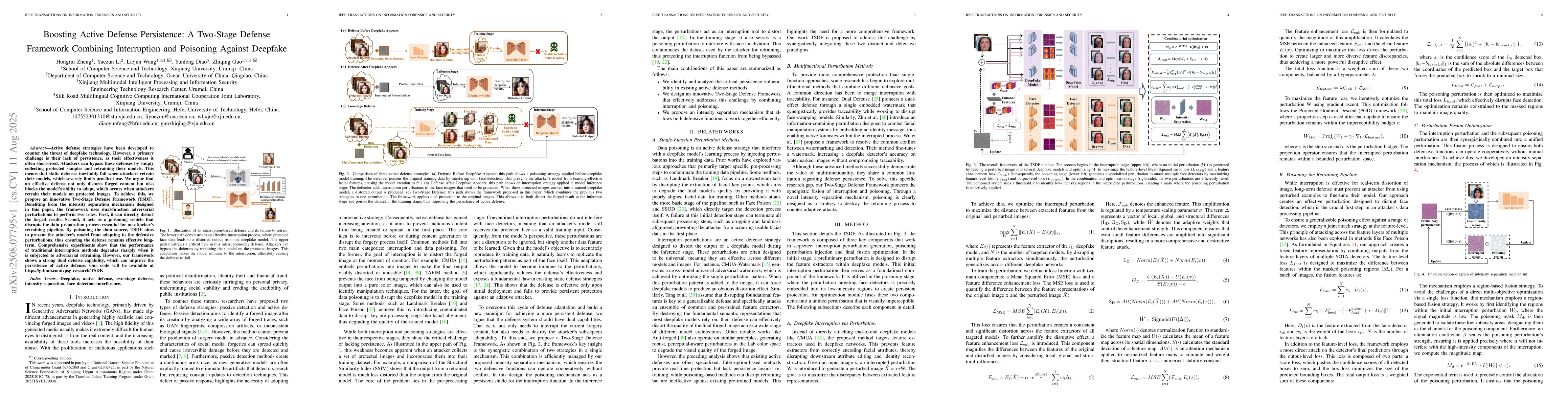 This research is significant as it addresses the critical lack of persistence in active defense strategies against deepfakes, proposing a novel framework that ensures long-term defense effectiveness by combining interruption and poisoning.