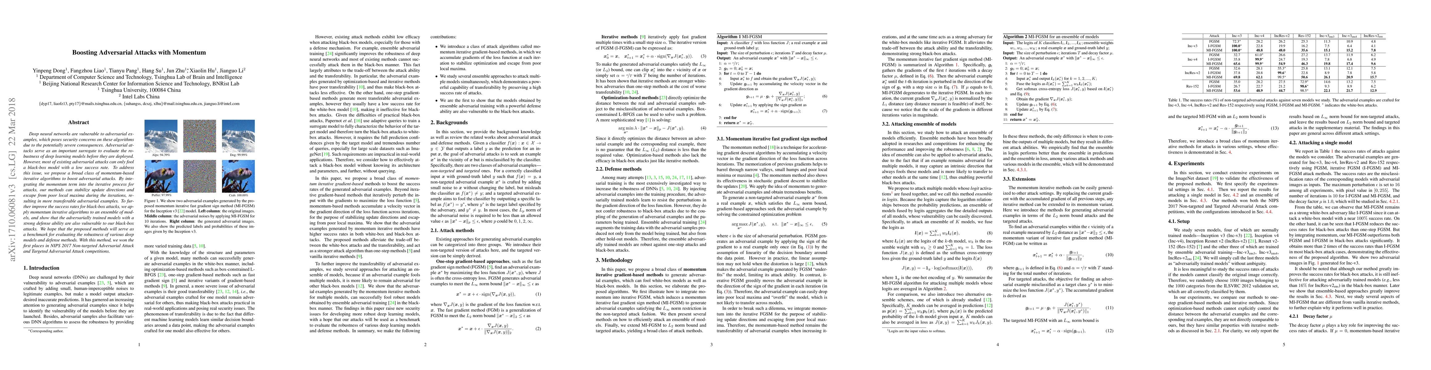Deep neural networks are vulnerable to adversarial examples, which poses security concerns on these algorithms due to the potentially severe consequences. Adversarial attacks serve as an important surrogate to evaluate the robustness of deep learning models before they are deployed. However, most of existing adversarial attacks can only fool a black-box model with a low success rate. To address this issue, we propose a broad class of momentum-based iterative algorithms to boost adversarial attacks. By integrating the momentum term into the iterative process for attacks, our methods can stabilize update directions and escape from poor local maxima during the iterations, resulting in more transferable adversarial examples. To further improve the success rates for black-box attacks, we apply momentum iterative algorithms to an ensemble of models, and show that the adversarially trained models with a strong defense ability are also vulnerable to our black-box attacks. We hope that the proposed methods will serve as a benchmark for evaluating the robustness of various deep models and defense methods. With this method, we won the first places in NIPS 2017 Non-targeted Adversarial Attack and Targeted Adversarial Attack competitions.