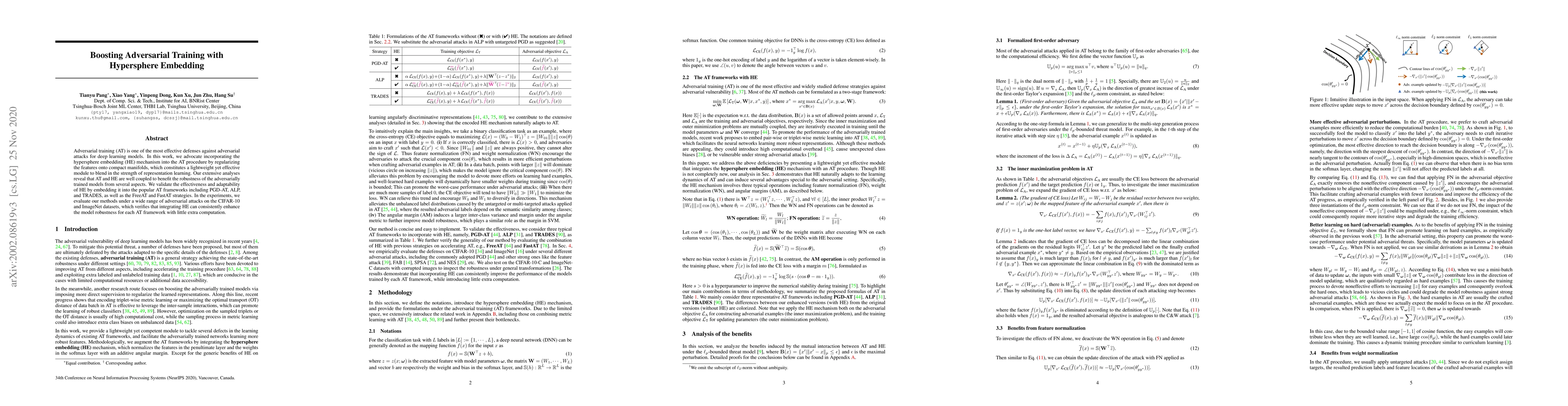 This paper proposes integrating the hypersphere embedding mechanism into adversarial training to regularize features onto compact manifolds, enhancing model robustness against adversarial attacks. Experiments on CIFAR-10 and ImageNet show that this approach improves the effectiveness of various adversarial training frameworks with minimal additional computational cost.