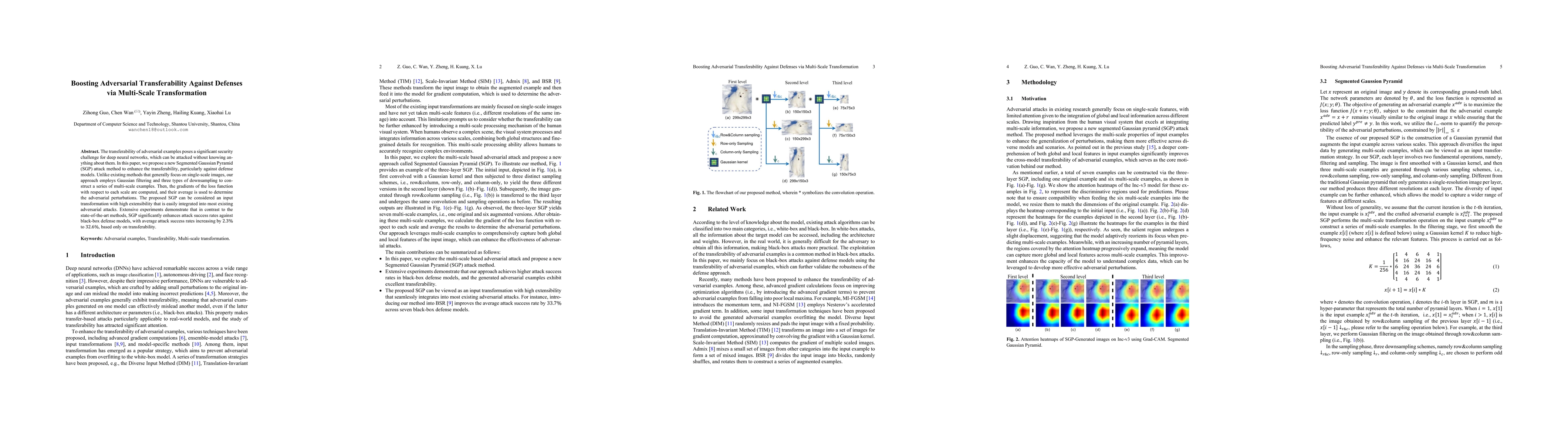 The transferability of adversarial examples poses a significant security challenge for deep neural networks, which can be attacked without knowing anything about them. In this paper, we propose a new Segmented Gaussian Pyramid (SGP) attack method to enhance the transferability, particularly against defense models. Unlike existing methods that generally focus on single-scale images, our approach employs Gaussian filtering and three types of downsampling to construct a series of multi-scale examples. Then, the gradients of the loss function with respect to each scale are computed, and their average is used to determine the adversarial perturbations. The proposed SGP can be considered an input transformation with high extensibility that is easily integrated into most existing adversarial attacks. Extensive experiments demonstrate that in contrast to the state-of-the-art methods, SGP significantly enhances attack success rates against black-box defense models, with average attack success rates increasing by 2.3% to 32.6%, based only on transferability.