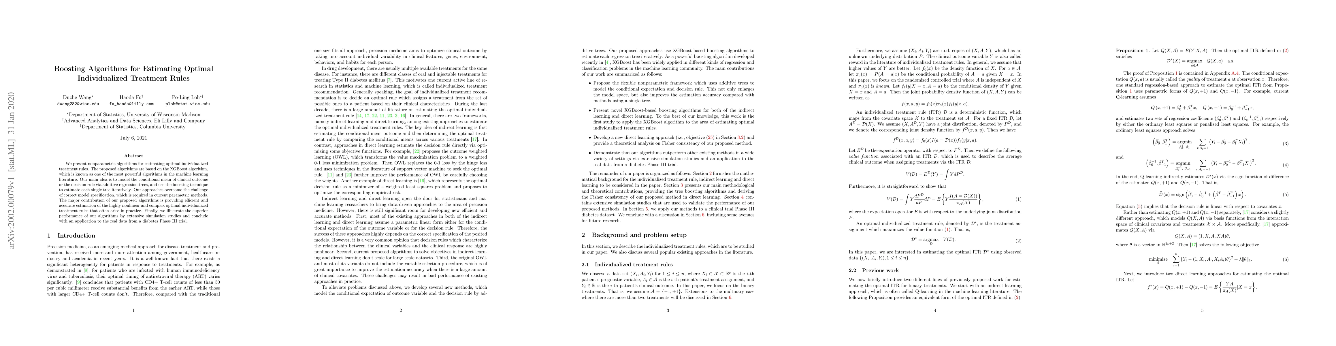 We present nonparametric algorithms for estimating optimal individualized treatment rules. The proposed algorithms are based on the XGBoost algorithm, which is known as one of the most powerful algorithms in the machine learning literature. Our main idea is to model the conditional mean of clinical outcome or the decision rule via additive regression trees, and use the boosting technique to estimate each single tree iteratively. Our approaches overcome the challenge of correct model specification, which is required in current parametric methods. The major contribution of our proposed algorithms is providing efficient and accurate estimation of the highly nonlinear and complex optimal individualized treatment rules that often arise in practice. Finally, we illustrate the superior performance of our algorithms by extensive simulation studies and conclude with an application to the real data from a diabetes Phase III trial.