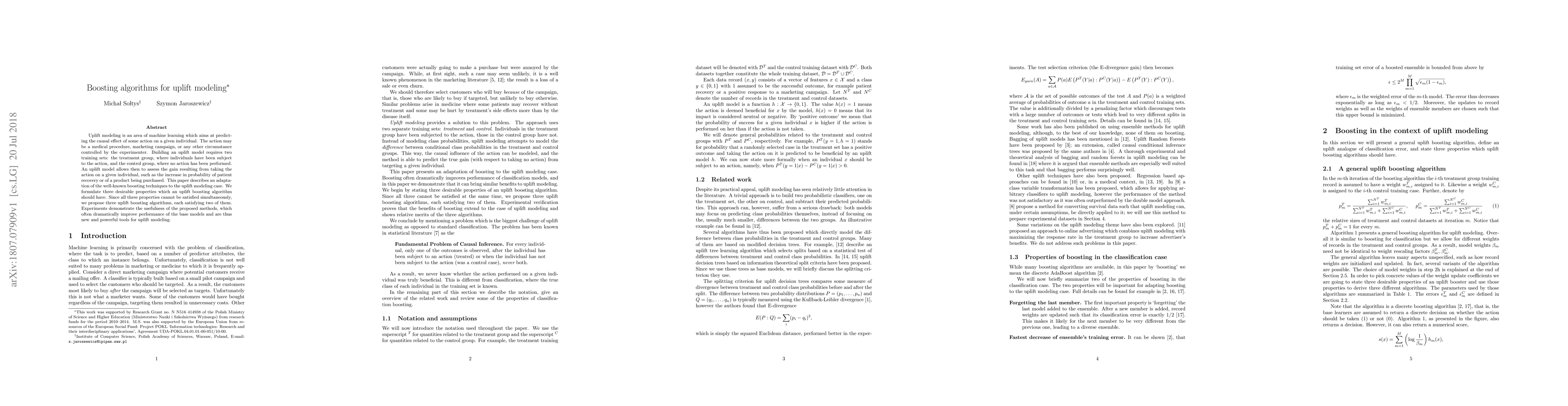 Uplift modeling is an area of machine learning which aims at predicting the causal effect of some action on a given individual. The action may be a medical procedure, marketing campaign, or any other circumstance controlled by the experimenter. Building an uplift model requires two training sets: the treatment group, where individuals have been subject to the action, and the control group, where no action has been performed. An uplift model allows then to assess the gain resulting from taking the action on a given individual, such as the increase in probability of patient recovery or of a product being purchased. This paper describes an adaptation of the well-known boosting techniques to the uplift modeling case. We formulate three desirable properties which an uplift boosting algorithm should have. Since all three properties cannot be satisfied simultaneously, we propose three uplift boosting algorithms, each satisfying two of them. Experiments demonstrate the usefulness of the proposed methods, which often dramatically improve performance of the base models and are thus new and powerful tools for uplift modeling.
