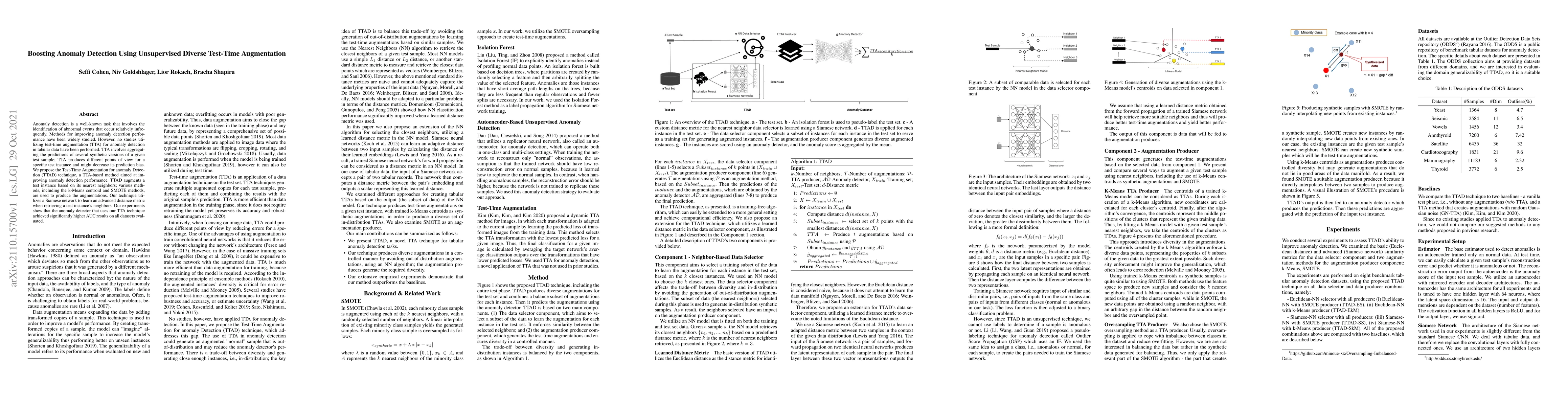 This paper proposes a Test-Time Augmentation for anomaly Detection (TTAD) technique that enhances anomaly detection performance by generating synthetic versions of test samples using TTA. The method significantly improves AUC results across evaluated datasets by leveraging diverse augmentations and a Siamese network for neighbor retrieval.