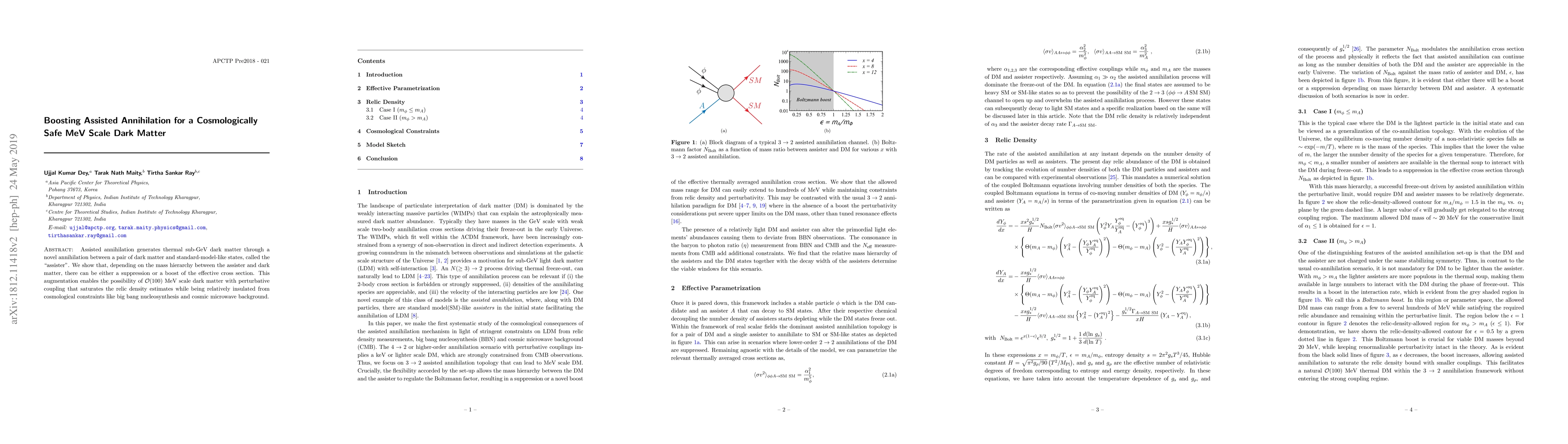 Assisted annihilation generates thermal sub-GeV dark matter through a novel annihilation between a pair of dark matter and standard-model-like states, called the "assister". We show that, depending on the mass hierarchy between the assister and dark matter, there can be either a suppression or a boost of the effective cross section. This augmentation enables the possibility of $\mathcal{O}(100)$ MeV scale dark matter with perturbative coupling that saturates the relic density estimates while being relatively insulated from cosmological constraints like big bang nucleosynthesis and cosmic microwave background.